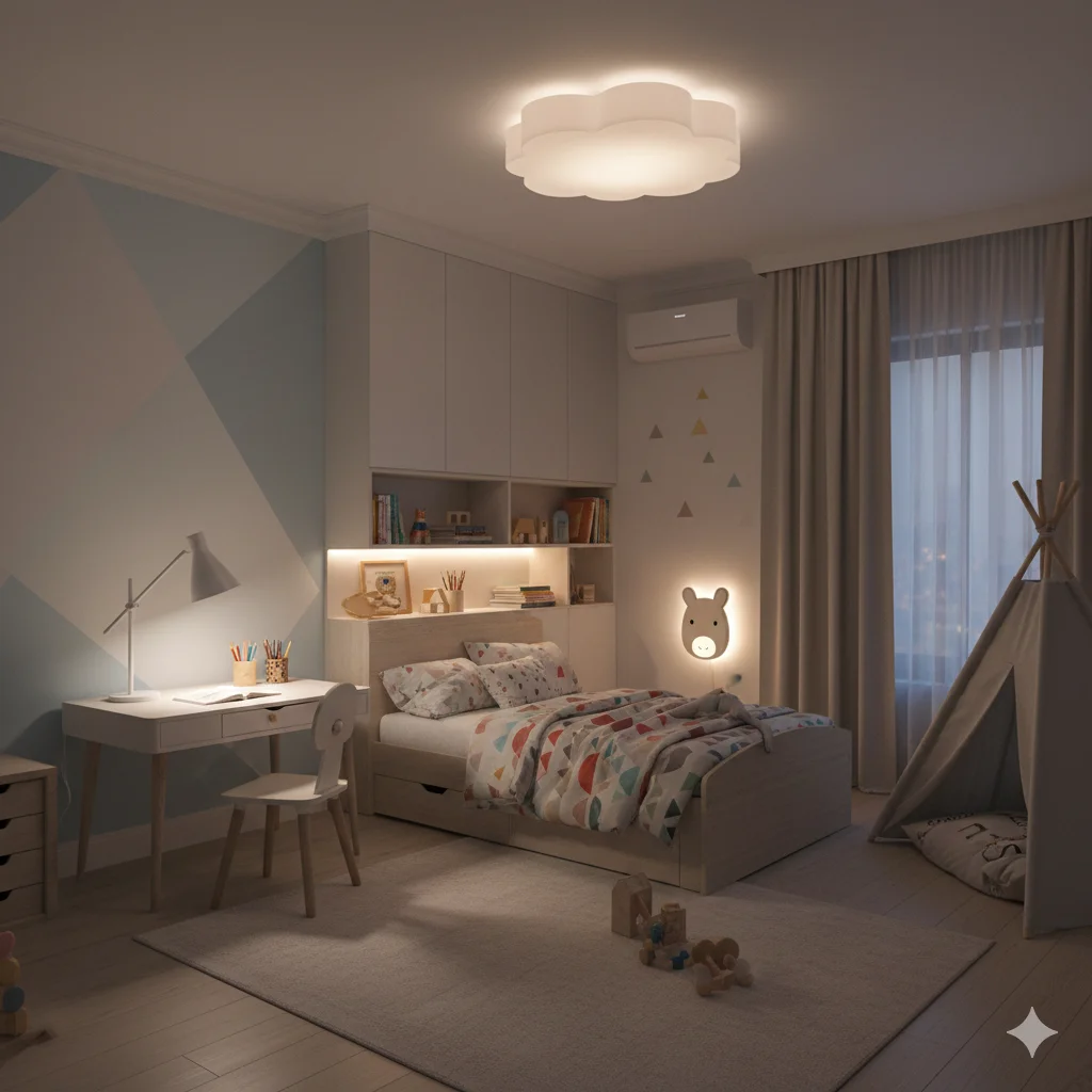 Организация света в детской комнате требует особого внимания к здоровью и безопасности ребенка. Здесь необходимо предусмотреть три основных сценария: яркое общее освещение для игр, качественную подсветку рабочего стола и мягкий ночной свет. В загородном доме для игровой зоны лучше использовать встроенные светильники, так как они безопаснее активных игр с мячом. Важно, чтобы световой поток был равномерным и не создавал резких контрастов, утомляющих детское зрение.