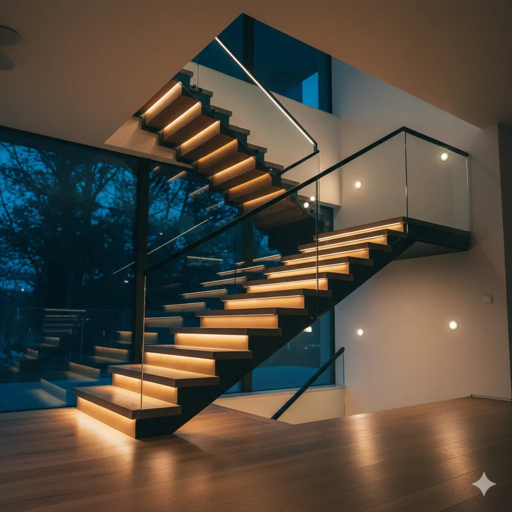 Безопасное перемещение между этажами загородного коттеджа напрямую зависит от качества светового сценария. Лестница является зоной повышенного риска, поэтому здесь необходимо предусмотреть бесперебойное и качественное освещение. Один из лучших приемов — установка точечных светильников, встроенных в стену вдоль каждой ступени или непосредственно в подступенки. Такой подход создает четкие границы каждой проступи, что критически важно в темное время суток для исключения травматизма в частном жилище.