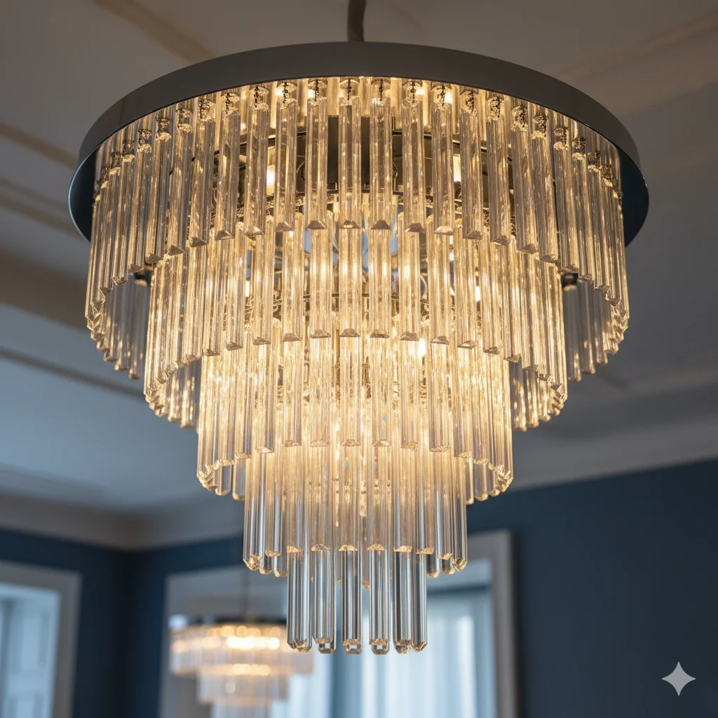 Люстра традиционно остается главным элементом декора и основным источником света в центральных зонах загородного жилья. В гостиной или столовой коттеджа она должен не только освещать пространство, но и служить визуальным центром интерьера. Необходимо выбирать размер изделия пропорционально площади комнате: слишком маленькая модель потеряется в просторном зале с высокими потолками. В частном доме лучше всего смотрятся каскадные конструкции, которые равномерно распределяют лучи во все стороны.