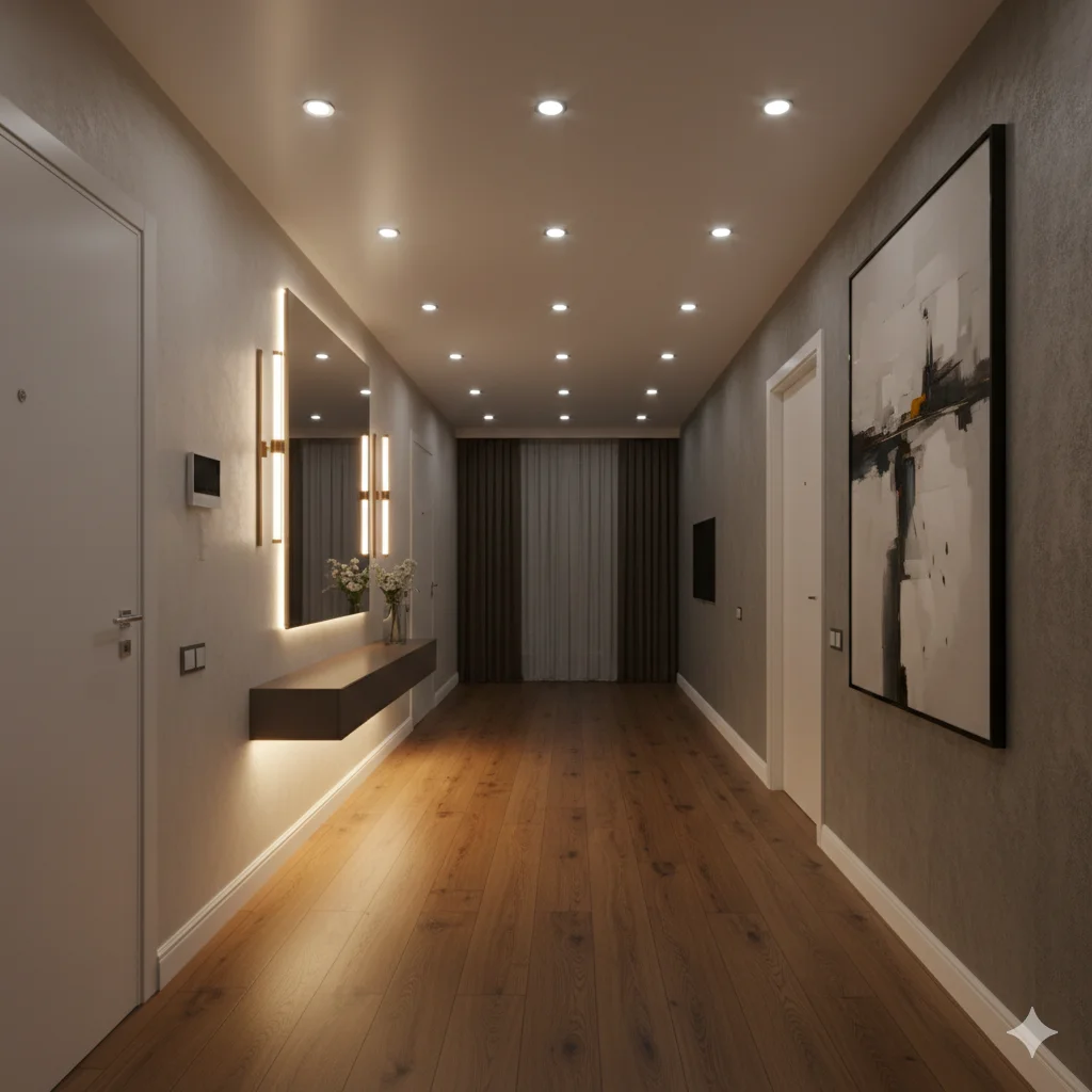 Прихожая в загородном доме — это первое помещение, которое видят гости, поэтому свет здесь должен быть гостеприимным и достаточно ярким. Поскольку в этой части коттеджа часто отсутствуют окна, необходимо компенсировать недостаток естественного освещения мощными потолочными источниками. Вдоль длинного коридора лучше установить одинаковые светильники на равном расстоянии, чтобы избежать появления мрачных зон. Это сделает переход между комнатами в частном жилище безопасным и комфортным.