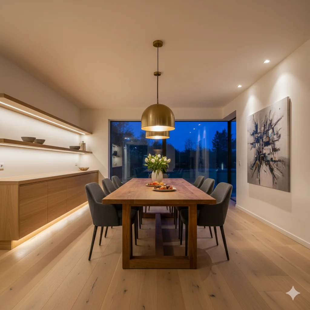 В столовой зоне загородного дома свет выполняет не только практическую, но и эстетическую роль, создавая атмосферу для семейных трапез. Центром композиции обязательно должен стать обеденный стол. Над ним необходимо разместить подвесные светильники, нижний край которых находится в 70–90 см от поверхности столешницы. Если стол длинный, лучше использовать группу из нескольких одинаковых плафонов, расположенных на равном расстоянии, чтобы свет равномерно заливал всю площадь и не оставлял теней по краям.