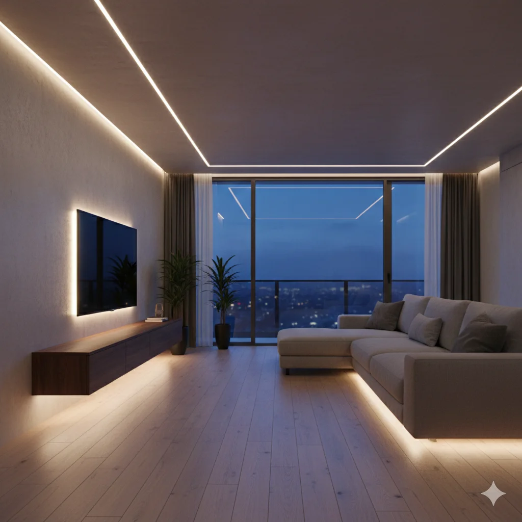 Светодиодная лента стала незаменимым инструментом для создания дизайнерского освещения в частном доме внутри. Она позволяет сделать пространство более объемным и «воздушным», создавая мягкое контурное свечение. В загородном жилье ее необходимо использовать для скрытой подсветки потолков, карнизов или плинтусов. Такой свет лучше всего подходит для вечернего времени, когда яркие люстры не нужны, а требуется лишь легкая навигационная подсветка, обеспечивающая уют и безопасность в каждой комнате.