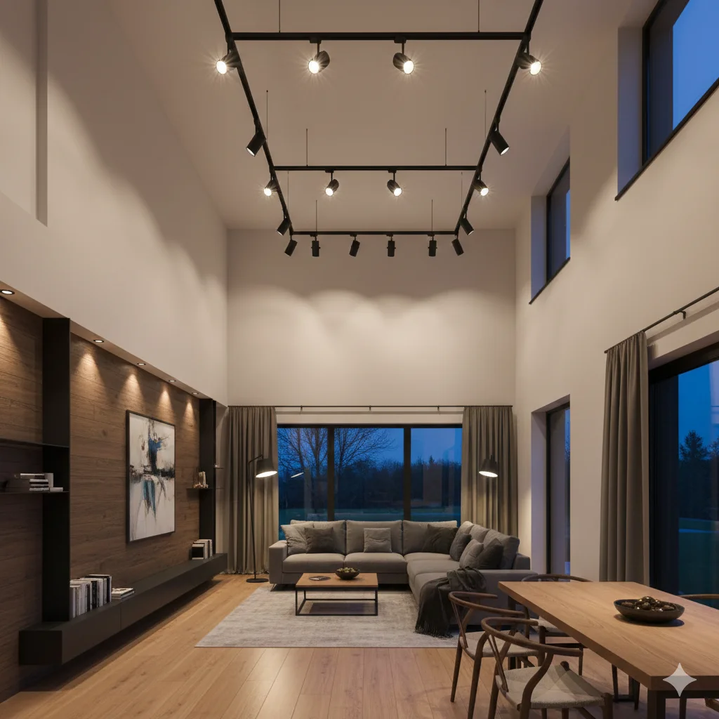 При проектировании освещения в частном доме внутри гостиной важно соблюдать баланс: расстояние между точечными источниками на потолке должен составлять около 100–150 см. Это обеспечит равномерность потока без темных пятен. Использование умных систем управления позволит одним нажатием переключать режимы от «вечеринки» до «кинотеатра», делая эксплуатацию частном коттеджа максимально комфортной и современной для всех гостей и домочадцев.