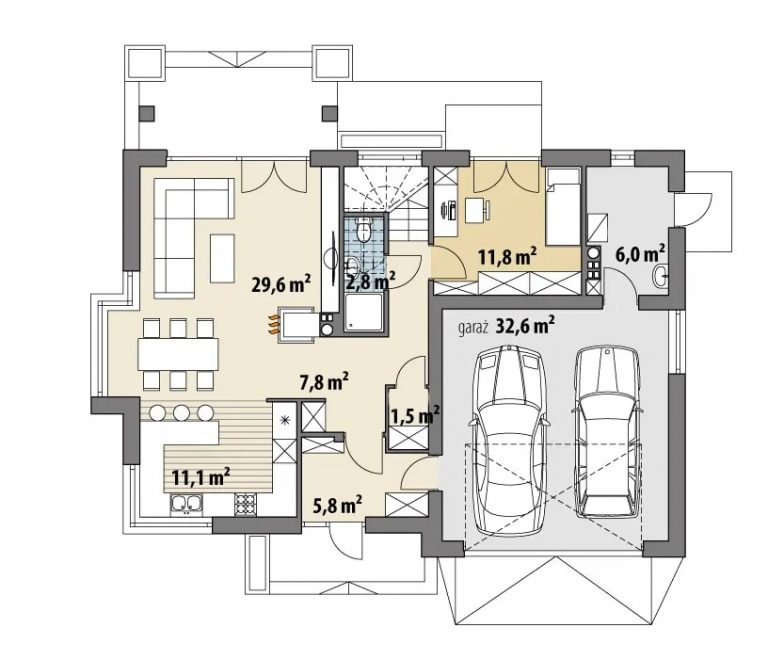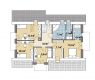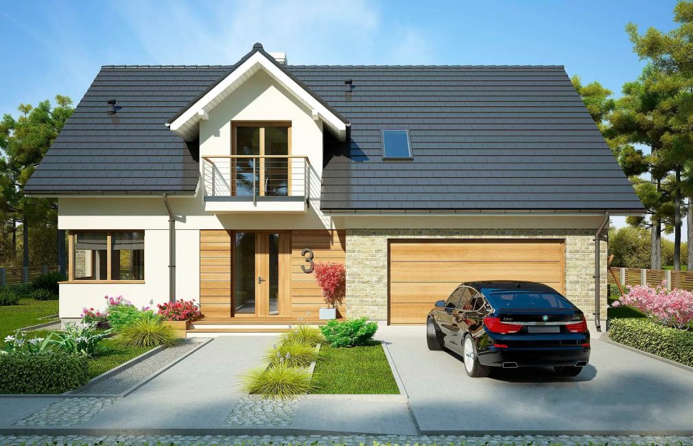 Это двухэтажный дом для семьи из 5-6 человек, любящей простор, респектабельность и комфорт. Он отличается продуманной рациональной планировкой. Так, балкон второго этажа является одновременно навесом над входной зоной, защищающем крыльцо осадков. Из прихожей, куда можно поставить пару шкафов, есть выход в гараж на два автомобиля и примыкающей к нему котельной. У нас так же имеются и другие проекты с гаражом на два автомобиля, например, каркасно-панельный дом AET-005