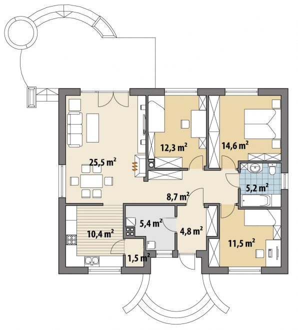 Одноэтажный компактный дом площадью почти 100 м2 предназначенный для семьи из 3-4 человек. Он отличается простой и логичной планировкой. Небольшая гостиная с камином, без которого трудно представить себе загородную жизнь, примыкает к изолированной кухне. Это идеальное решение для рачительной домохозяйке, которая не любит «делиться» с гостями запахами готовки, ведь они не всегда бывают приятными. Помещение достаточно просторно, чтобы вместить все, что нужно продвинутому кулинару, и имеет удобную для расстановки мебели квадратную форму. Есть даже кладовая, предназначенная для хранения сыпучих и консервированных продуктов. Большой семье, ищущей большой дом, можем порекомендовать обратить свое внимание на этот просторный одноэтажный дом AET-017.