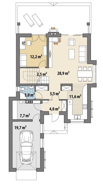 Площадь дома относительно невелика — всего 163 м2. Но при этом он вмешает в себя все, что нужно для комфортного проживания семьи. Так, на первом этаже находится кухня, гостиная, совмещенная с столовой, просторная (более 11,6 м2) кухня, и жилая комната, которая может быть как спальней, так и кабинетом, мастерской, домашним кинотеатром и проч. Рядом находится санузел с душевой кабиной. Если вас интересуют более большие дома, обратите внимание на еще один из наших домов проекта AET-003.