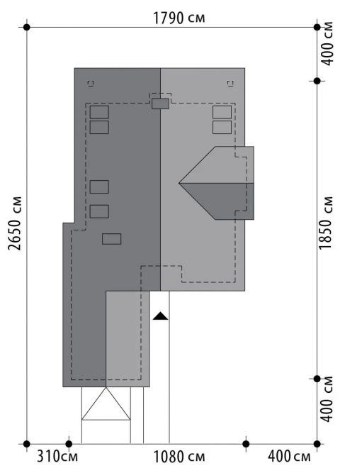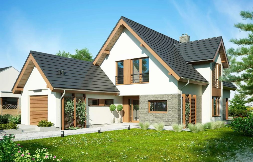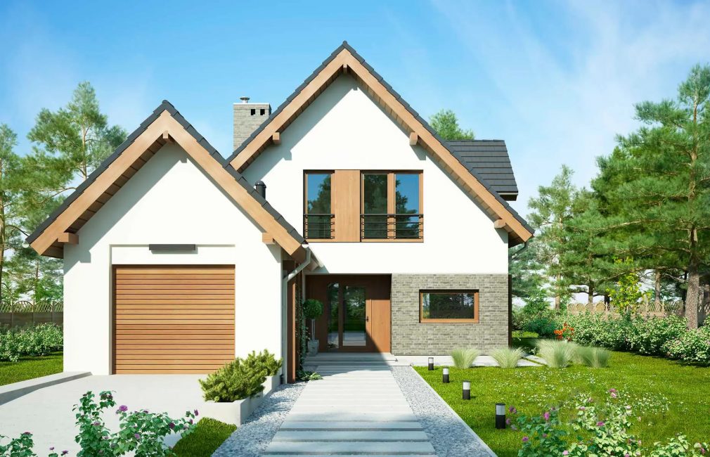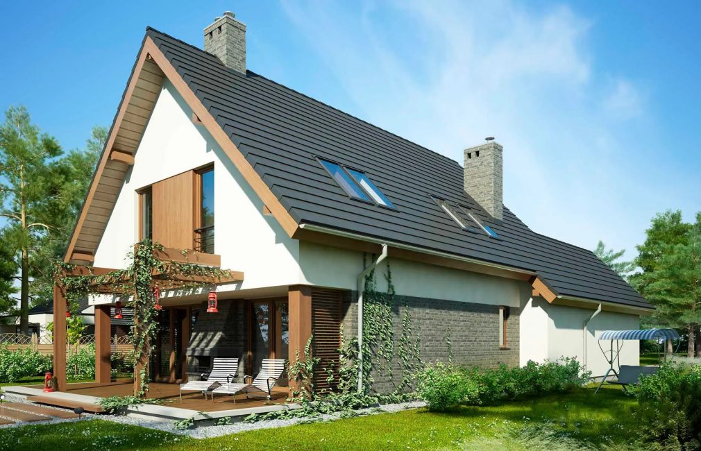 Этот двухэтажный загородный коттедж, рассчитанный на семью из 3-5 человек, имеет вытянутую форму, что делает его прекрасным решением для узкого участка. Строение отличается интересным с точки зрения архитектуры обликом — он как будто собран из трех уютных домиков, объединенных одной многоскатной крышей. На промо-изображениях она покрыта металлической фальцевой кровлей, но возможны и другие варианты, например, гибкая битумная черепица, которая идеально подходит для сложных крышных конструкций.