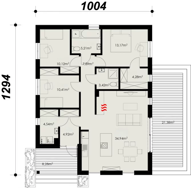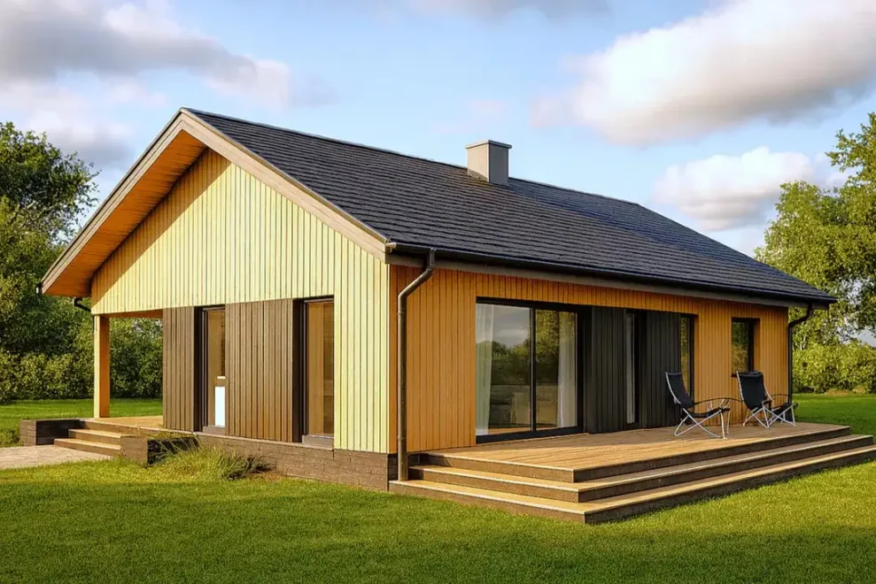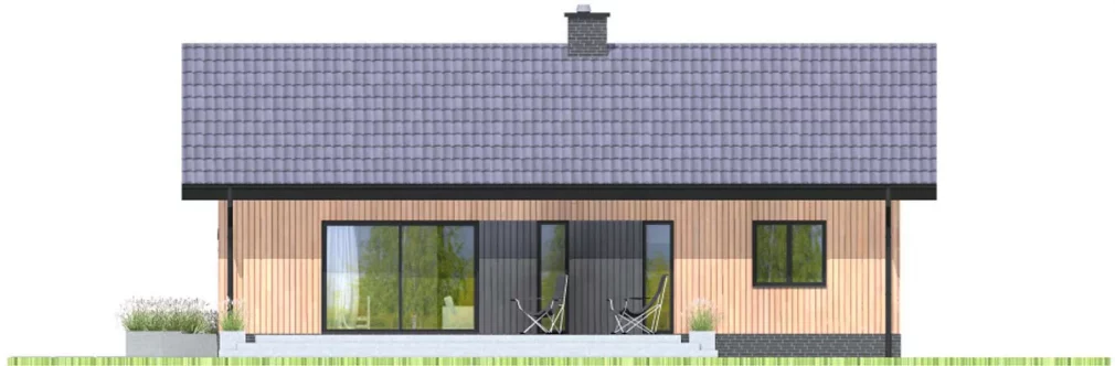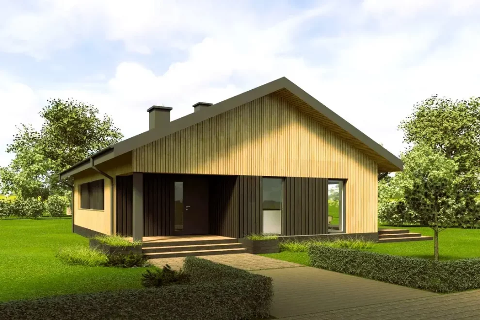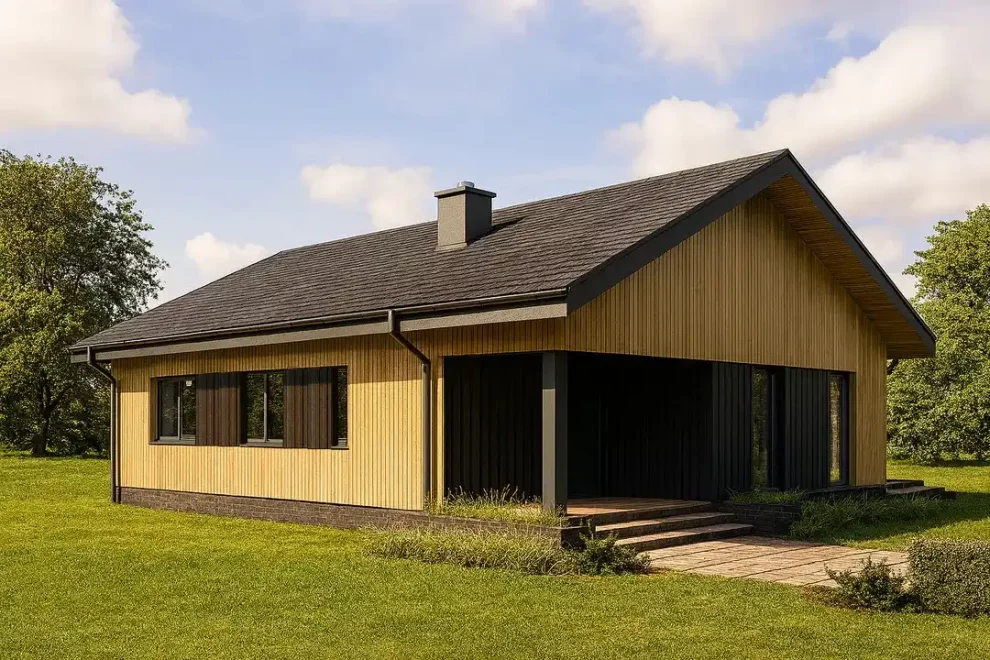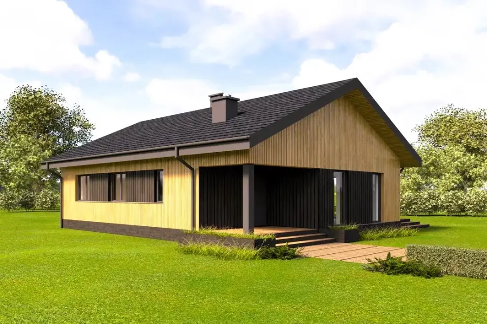 Открытая терраса и крытая веранда станут любимым местом отдыха на свежем воздухе, где можно устраивать завтраки, вечерние посиделки или уютные семейные встречи. Благодаря лаконичной форме крыши и простым конструктивным решениям строительство этого каркасного дома одноэтажного под ключ будет максимально быстрым и экономичным.