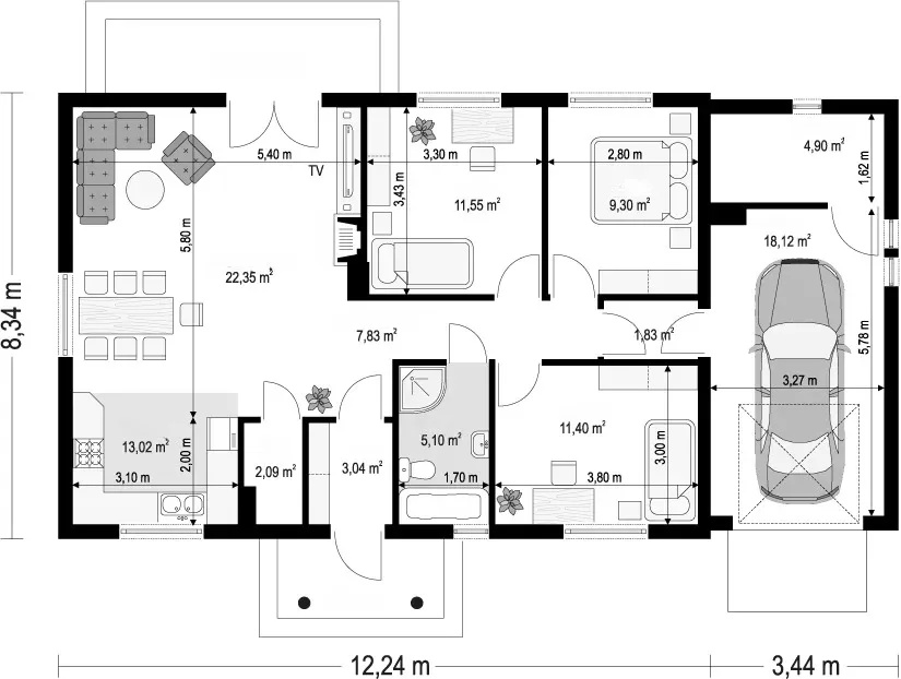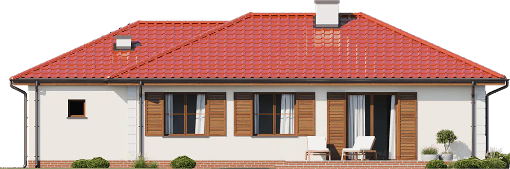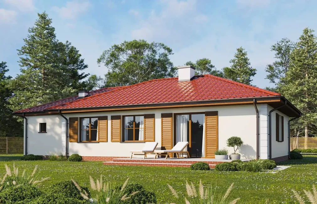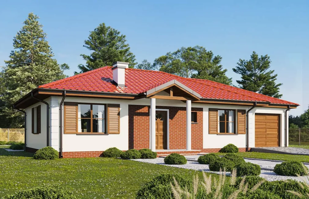 Этот современный одноэтажный дом площадью 110 м² — идеальный вариант для семьи, которая ценит комфорт и продуманную организацию пространства. Несмотря на компактность, проект включает всё необходимое для постоянного проживания: три уютные спальни, просторную гостиную, совмещённую со столовой, отдельную кухню, удобный холл и функциональные хозяйственные помещения.