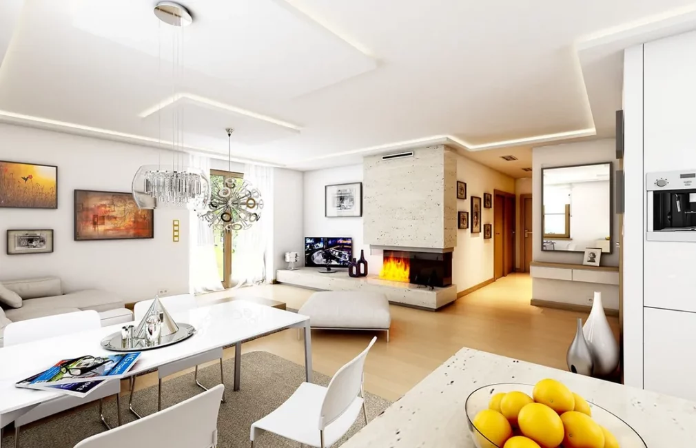 Гостиная с выходом на участок создаёт ощущение открытости и простора, а кухня площадью более 13 м² позволит разместить всю необходимую технику и рабочие зоны. Благодаря продуманной планировке одноэтажного дома каждая комната получает максимум естественного света.