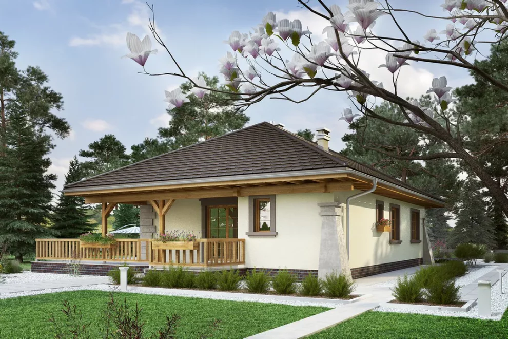 Этот современный одноэтажный каркасный дом общей площадью 86 м² создан для комфортного круглогодичного проживания семьи из 3–4 человек. Компактная, но функциональная планировка одноэтажного дома включает просторную гостиную с камином и объединённую с ней кухню, три уютные спальни, две ванные комнаты и удобные коридоры.