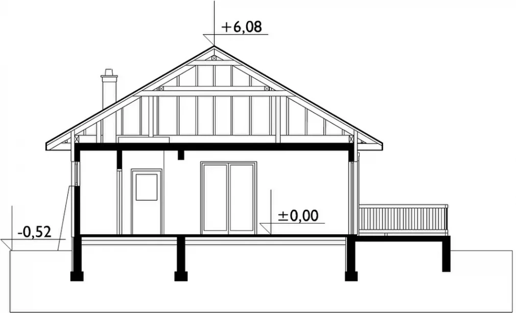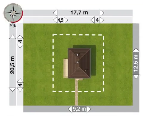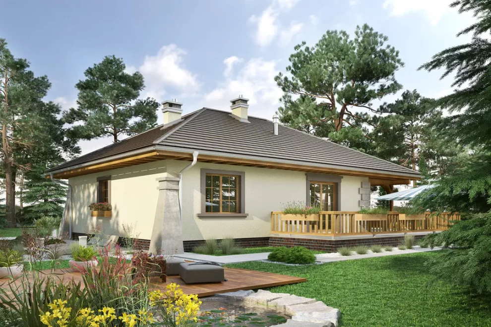 Проект разработан с учётом особенностей участков средней ширины и въезда с южной стороны, а четырёхскатная крыша гарантирует долговечность и надёжную защиту от осадков. Простая форма здания упрощает строительство и снижает расходы, что делает этот вариант отличным выбором для тех, кто планирует построить одноэтажный каркасный дом под ключ быстро и без лишних затрат.