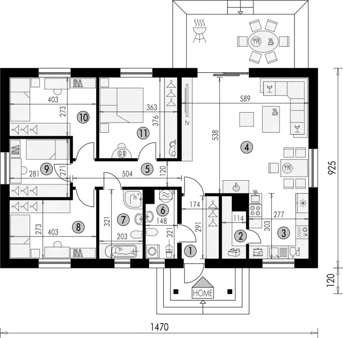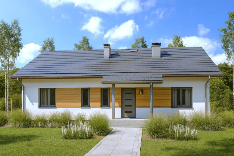 Просторный одноэтажный каркасный дом площадью 110 м² создан для комфортного круглогодичного проживания большой семьи. Его грамотная планировка одноэтажного дома включает четыре полноценные спальни, просторную гостиную, совмещённую со столовой, отдельную кухню, две ванные комнаты и практичное хозяйственное помещение.