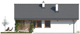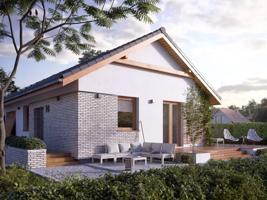 Терраса у дома станет отличным местом для отдыха на свежем воздухе. Благодаря классической двускатной крыше и сдержанным архитектурным акцентам дом выглядит элегантно и гармонично вписывается в любое окружение.