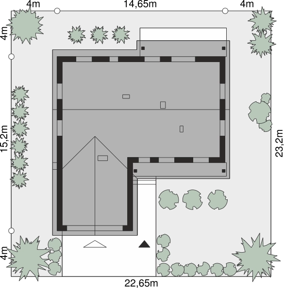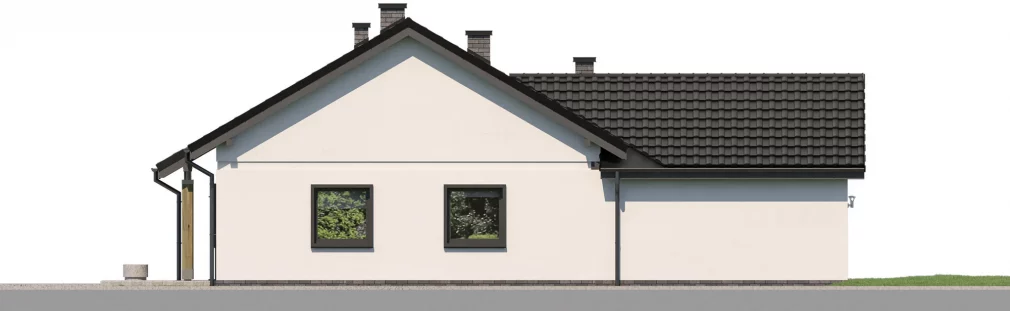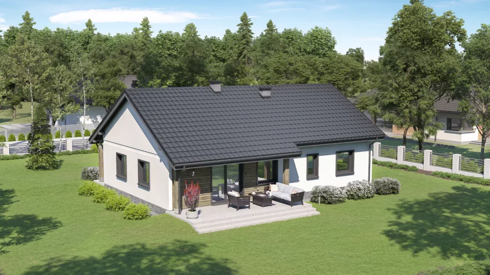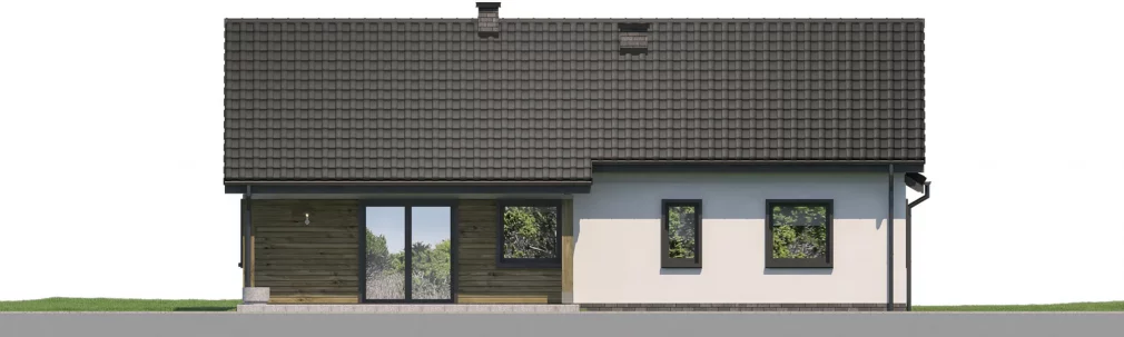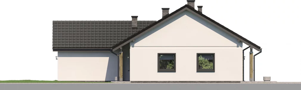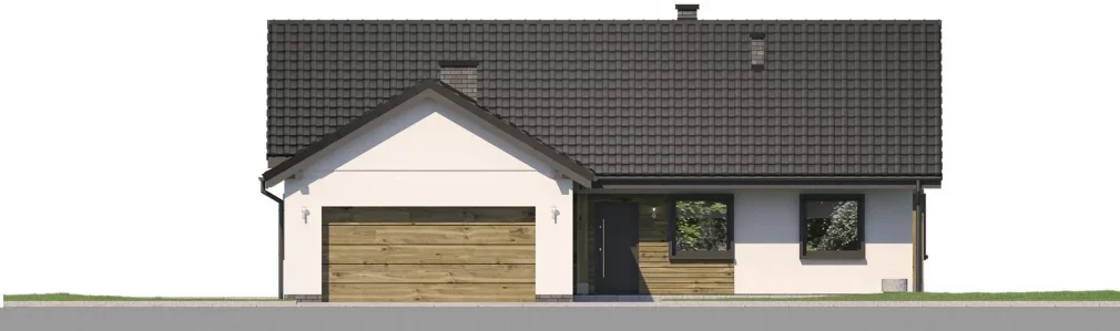 Снаружи дом выглядит стильно и сдержанно: чистые линии фасада, сочетание светлой штукатурки и деревянных акцентов создают ощущение уюта и стабильности. Двухместный гараж встроен в объём здания, что делает дом компактным и экономным в строительстве.