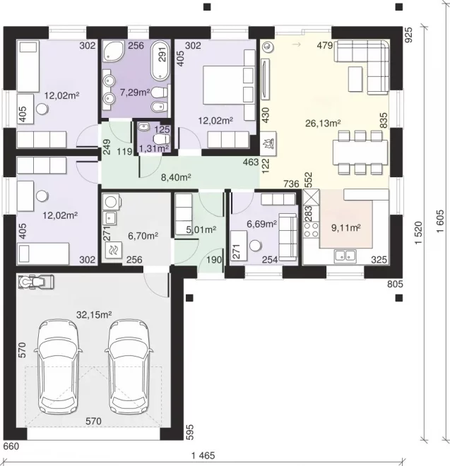 Просторный и современный одноэтажный дом с гаражом, в котором объединены практичность, комфорт и лаконичная архитектура. Проект разработан с ориентацией на тех, кто ценит функциональные решения и предпочитает жизнь на одном уровне без лишних лестниц и перепадов.