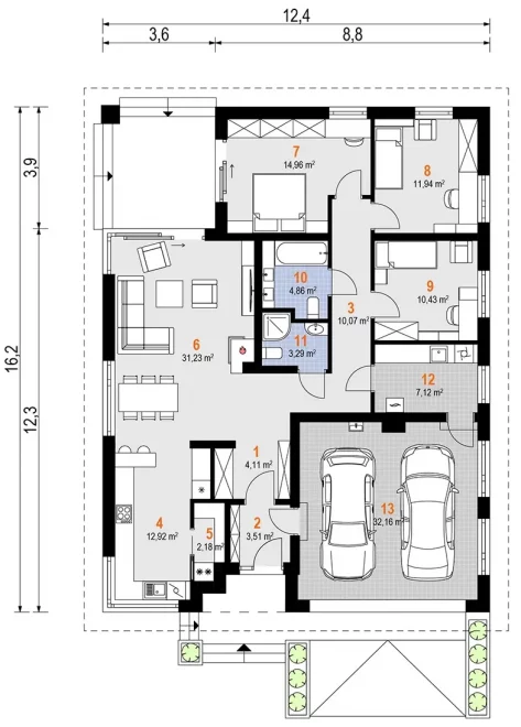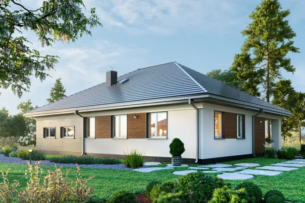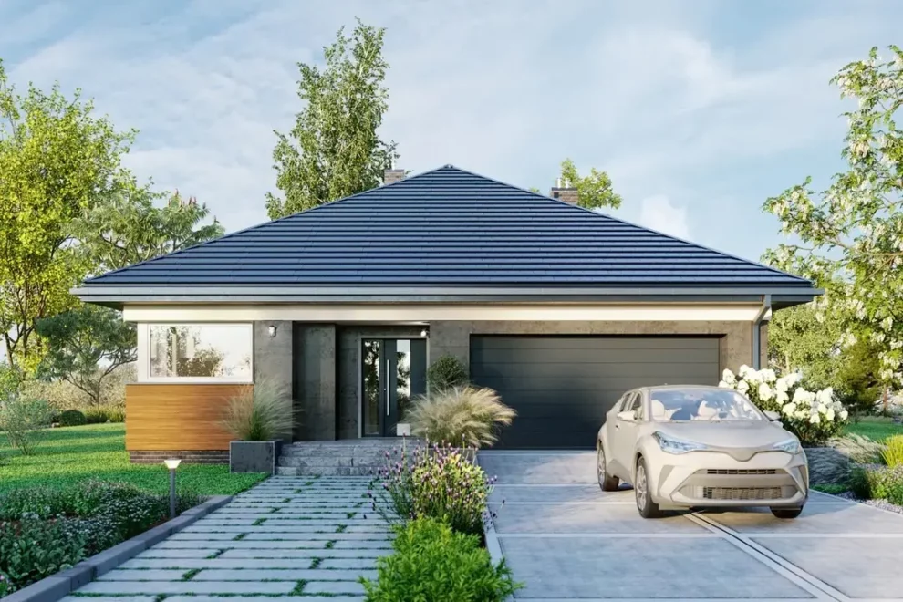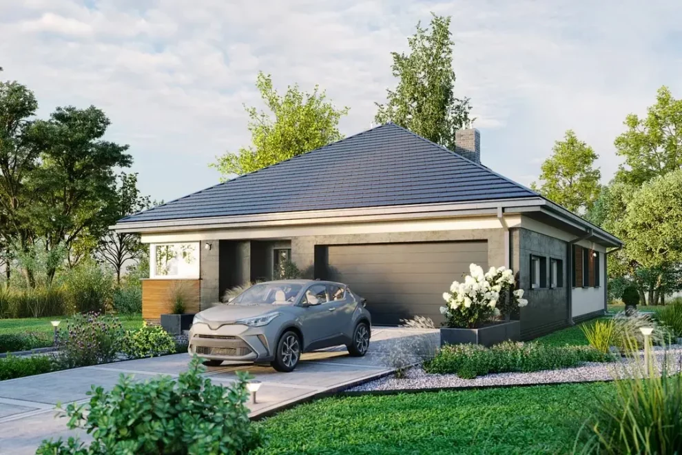 Современный одноэтажный дом с гаражом на два автомобиля сочетает в себе комфорт, функциональность и элегантный внешний вид. Дом рассчитан на семью из 3–5 человек, предоставляя простор для жизни и личного пространства.