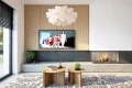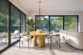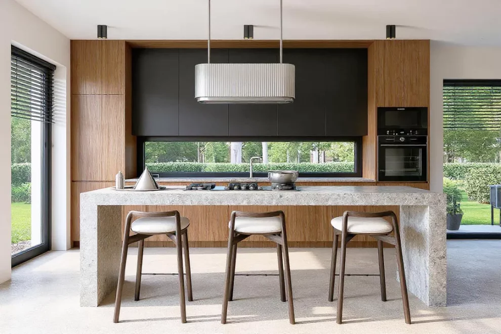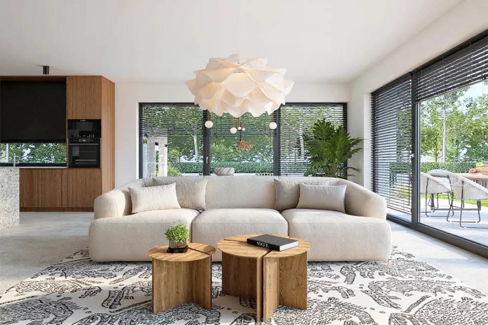 Дневная зона объединяет гостиную и кухню, создавая просторное и светлое пространство для совместного времяпрепровождения. Панорамные окна и угловая терраса визуально расширяют интерьер, соединяя его с садом и обеспечивая максимальный обзор. Кухня дополнена кладовой и эргономичными решениями для хранения.