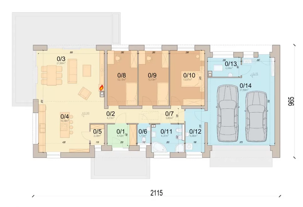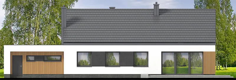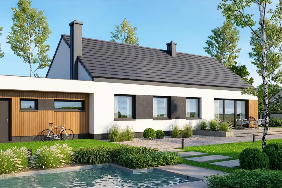 Проект дома AET-118 — это современный одноэтажный дом с гаражом на два автомобиля, созданный для семьи из 4–5 человек. Стильное сочетание скатной и плоской крыши придаёт дому выразительный характер, а материалы фасада подчёркивают современный дизайн.