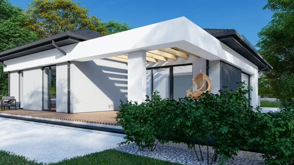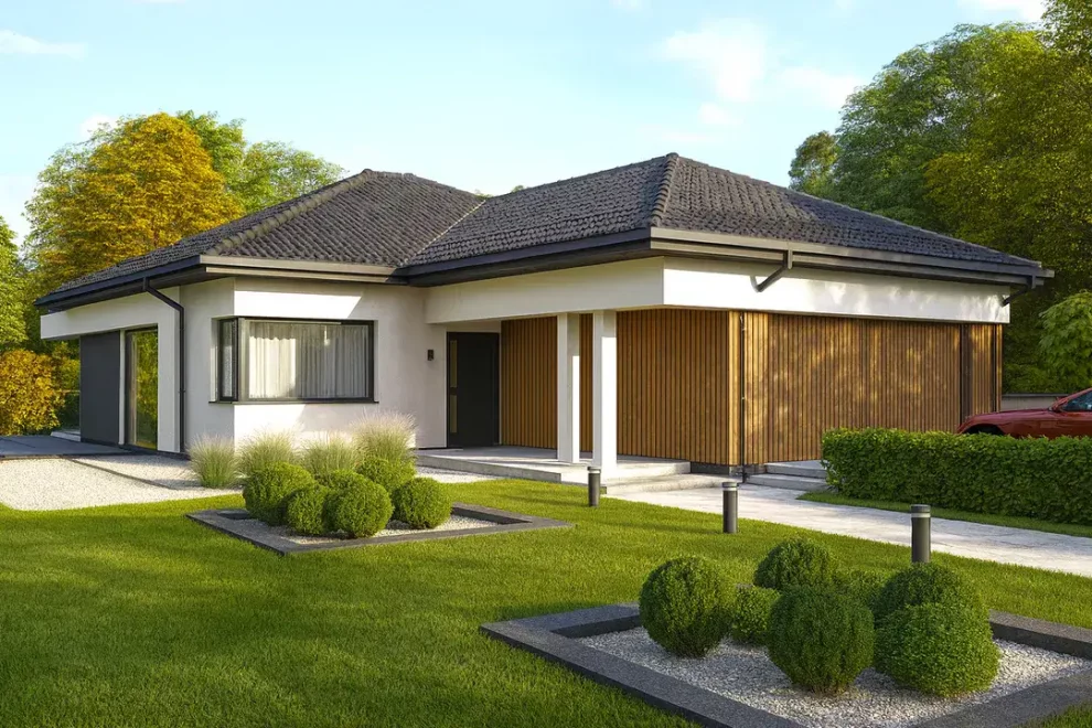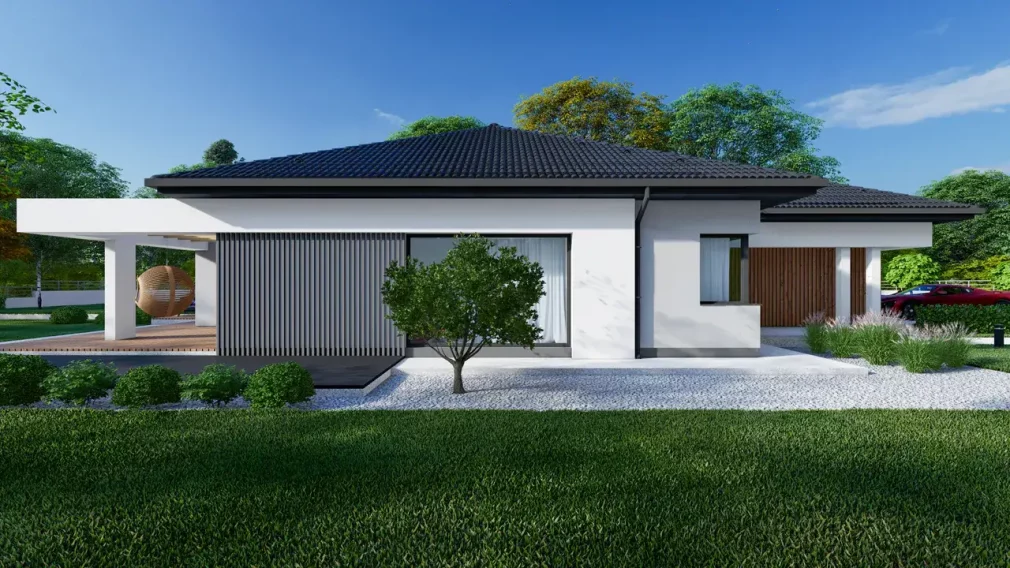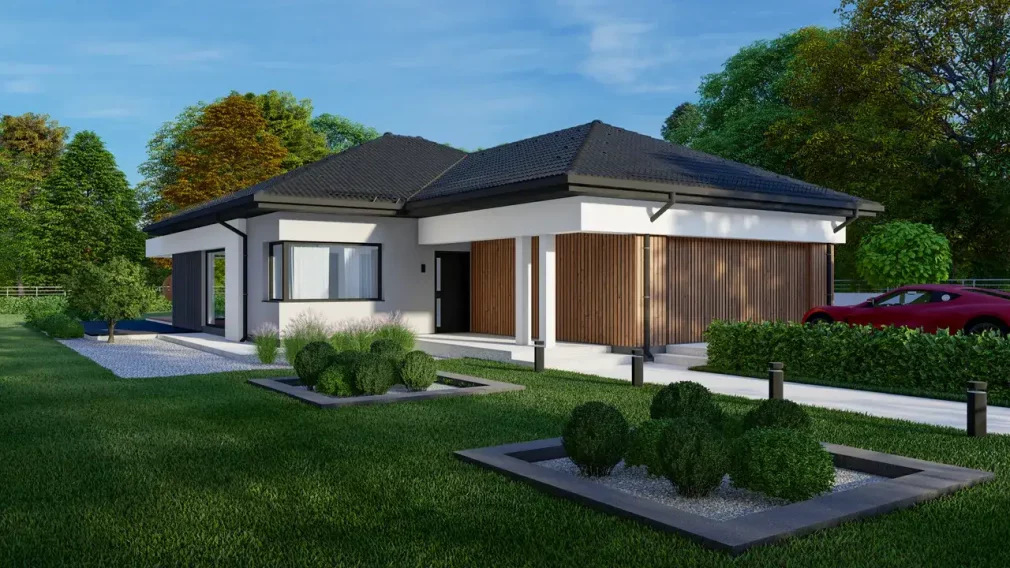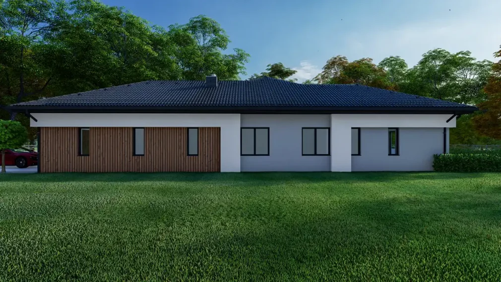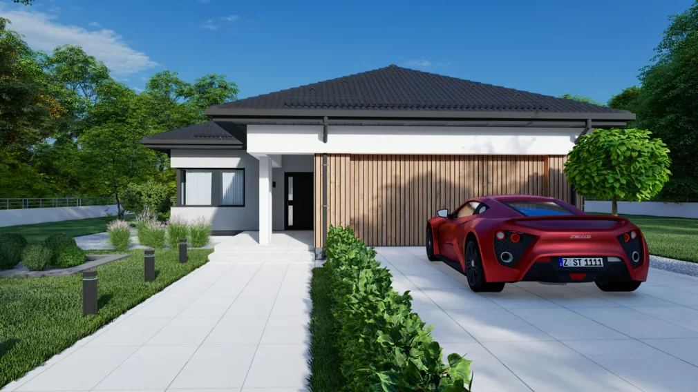 Проект дома AET-120 — это элегантный и просторный одноэтажный дом с гаражом на два автомобиля, выполненный в современном стиле с использованием архитектурного бетона и натурального дерева. Его выразительная композиция с выступающим гаражом придаёт постройке динамичный и уверенный характер, подчеркивая архитектурную эстетику современного жилья.