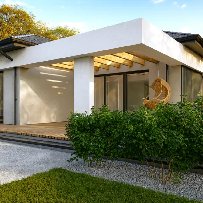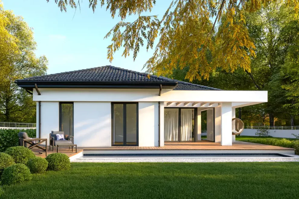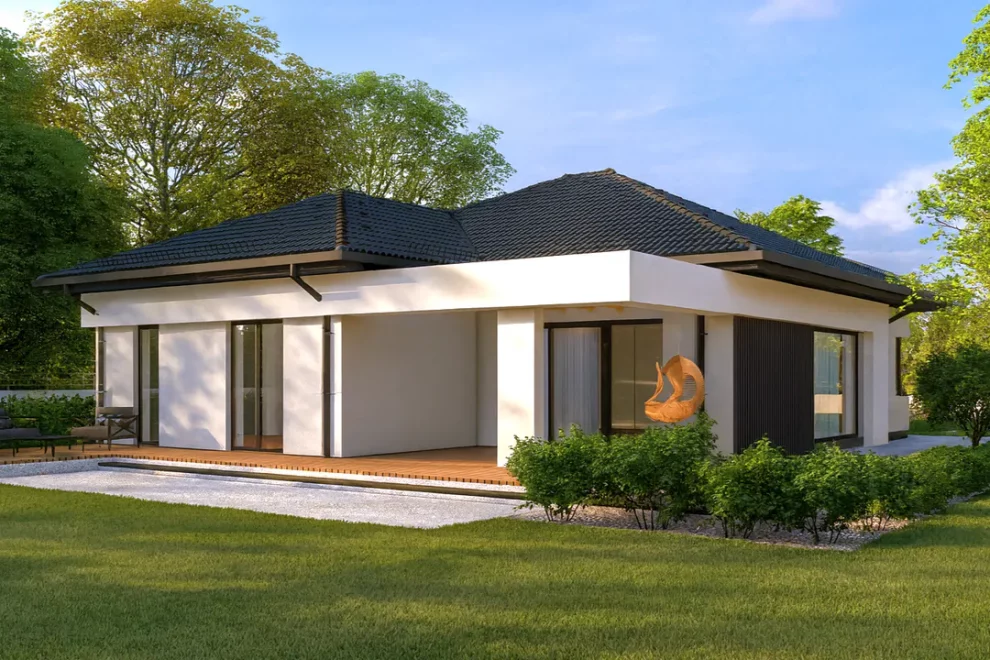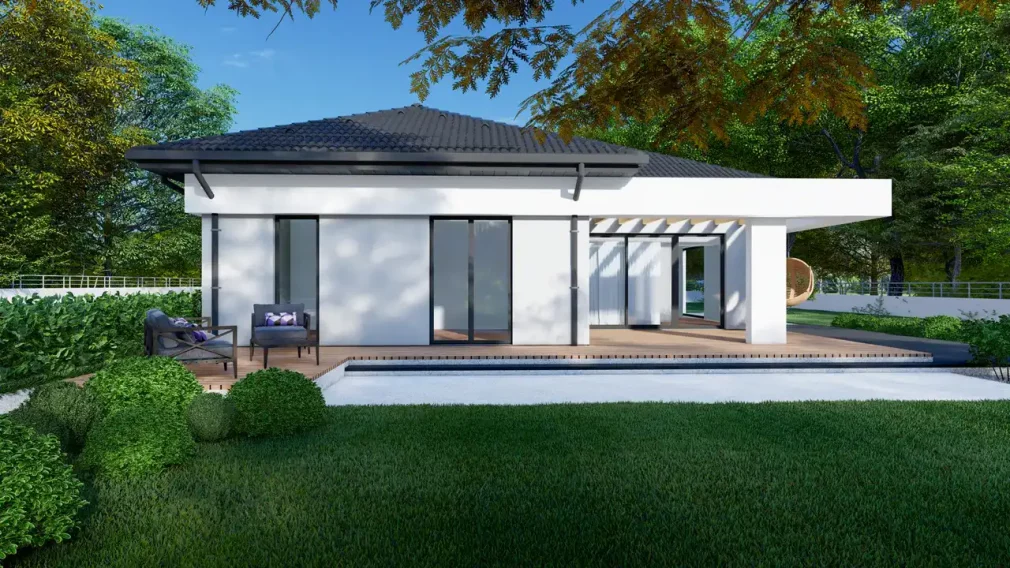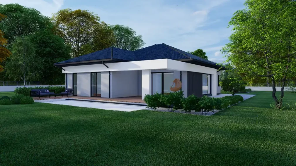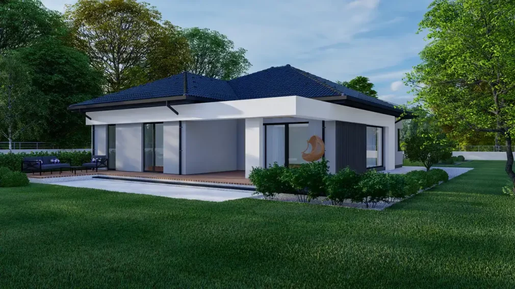 Проект дома AET-120 — это элегантный и просторный одноэтажный дом с гаражом на два автомобиля, выполненный в современном стиле с использованием архитектурного бетона и натурального дерева. Его выразительная композиция с выступающим гаражом придаёт постройке динамичный и уверенный характер, подчеркивая архитектурную эстетику современного жилья.