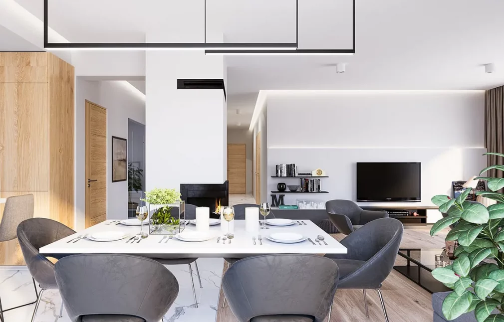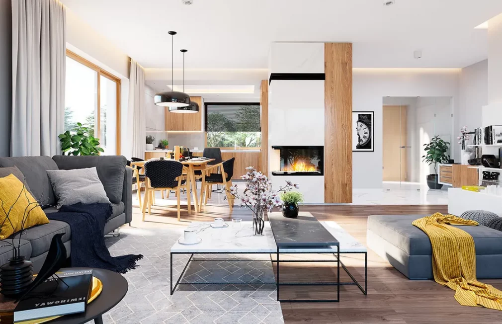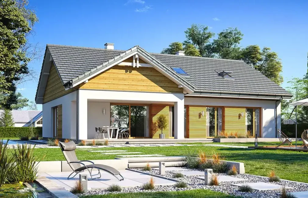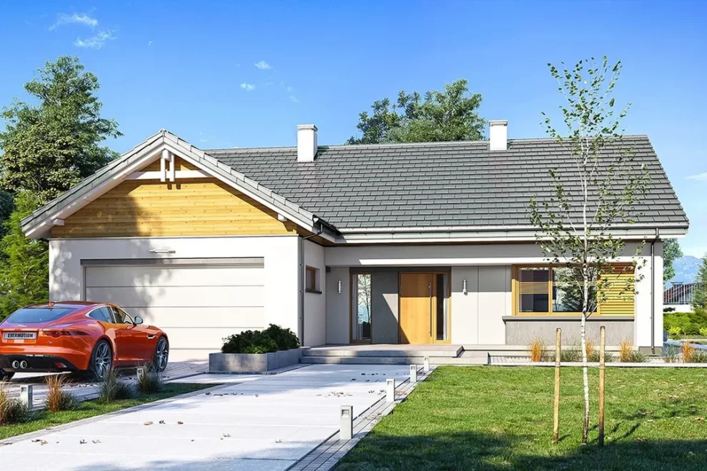 Проект дома AET-121 — это современный и функциональный одноэтажный дом с двускатной крышей и гаражом на два автомобиля, выполненный в лаконичном архитектурном стиле. Простая форма, выразительные детали и большие панорамные окна делают этот дом гармоничным сочетанием эстетики и практичности.