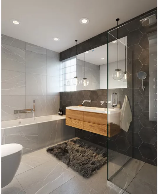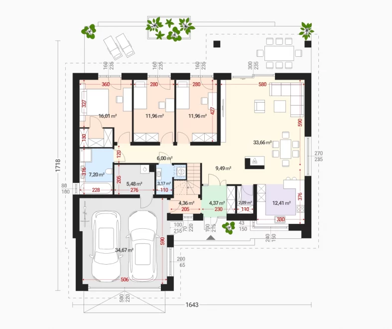 В приватной зоне расположены три спальни: главная — с собственной гардеробной, а детские — со встроенными шкафами и выходом на террасу. Дополняют функциональное пространство две ванные комнаты и отдельная гардеробная при входе. Из тамбура предусмотрен удобный проход в гараж и котельную, что повышает комфорт ежедневного пользования.