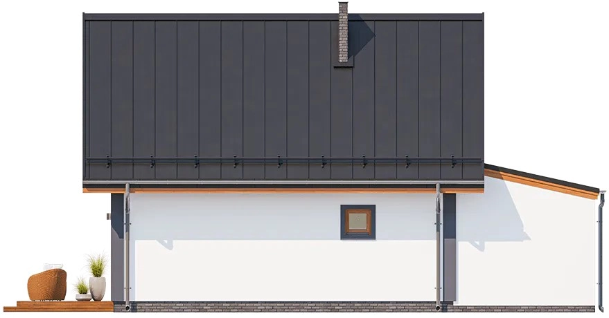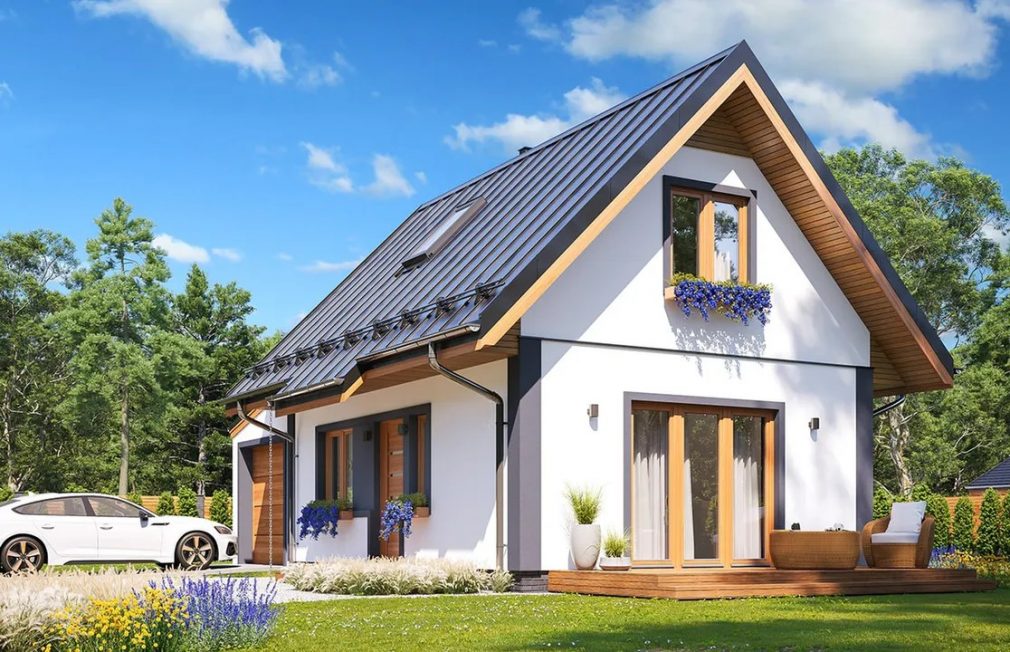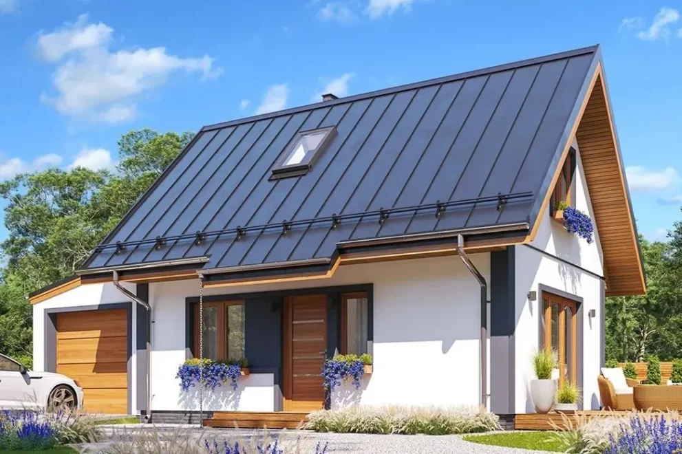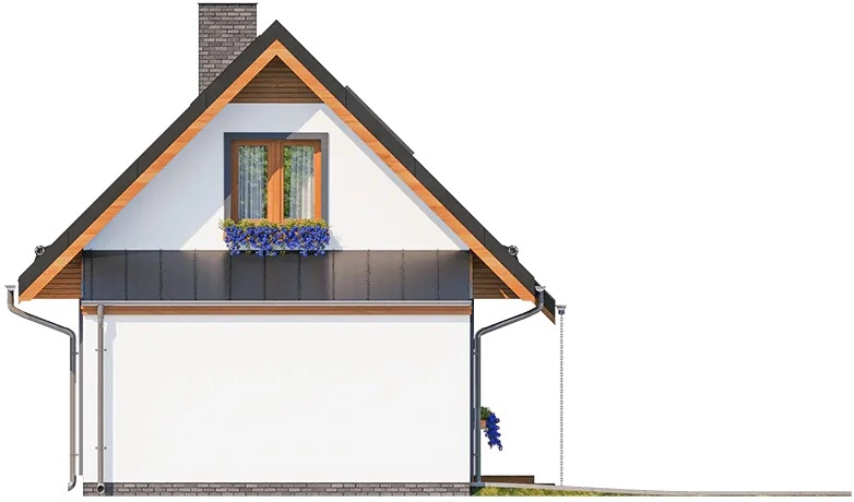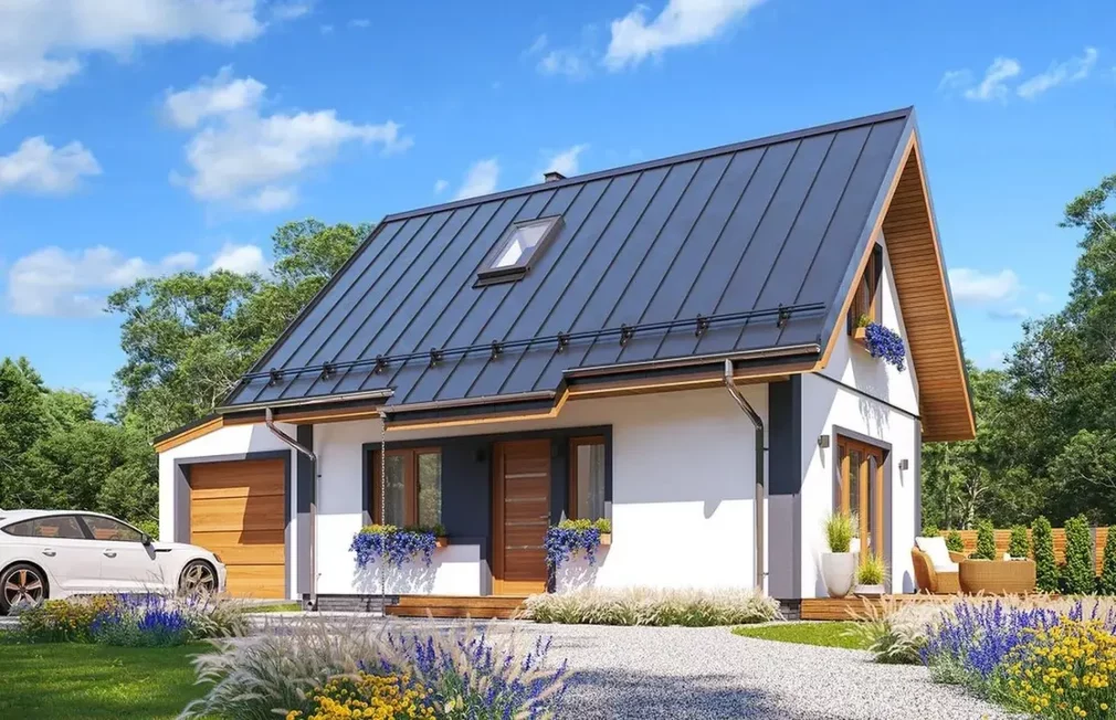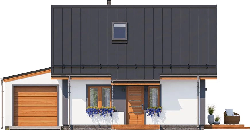Этот небольшой дом с гаражом и мансардой сочетает комфорт, экономичность и практичный дизайн, предлагая всё необходимое для жизни за городом или на даче.
