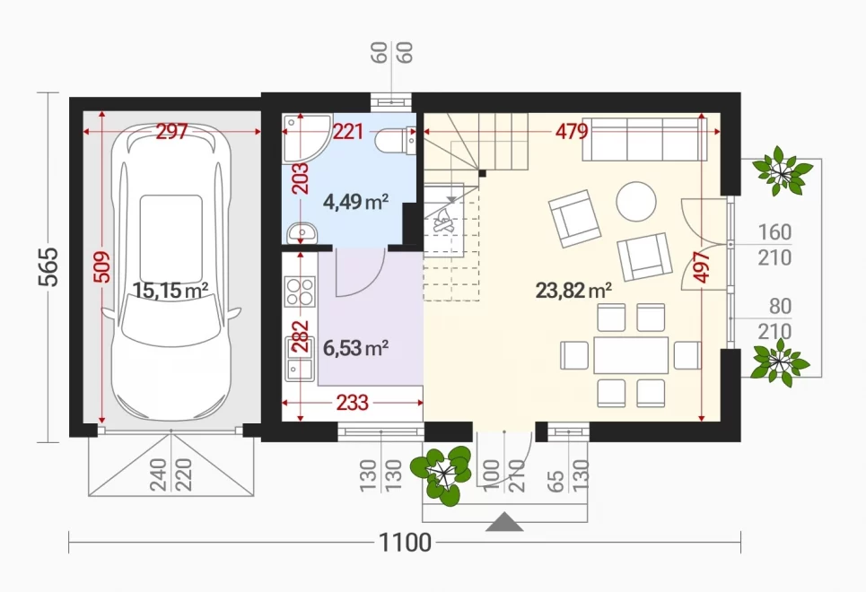 Фасад дома выполнен в спокойных тонах, с акцентом на лаконичность форм и гармонию с природой. Компактная застройка делает проект подходящим даже для небольших участков, а энергоэффективные решения снижают эксплуатационные расходы.