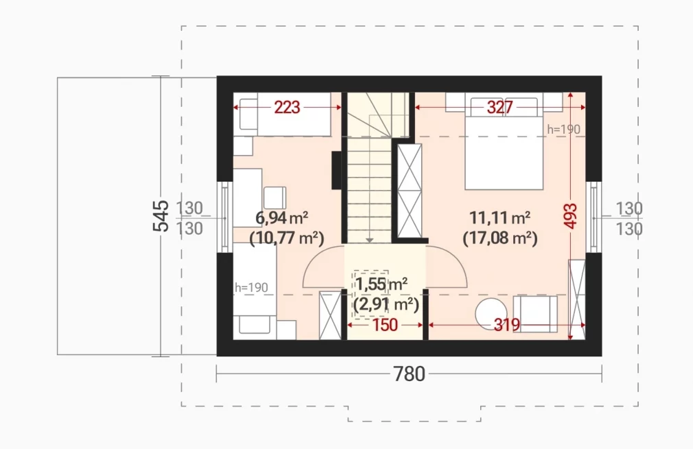 Мансардный этаж включает две светлые спальни и небольшой холл, создавая приватную зону отдыха. Благодаря наклонной крыше с углом 45° помещения под мансардой получаются объёмными и светлыми, что визуально увеличивает пространство.