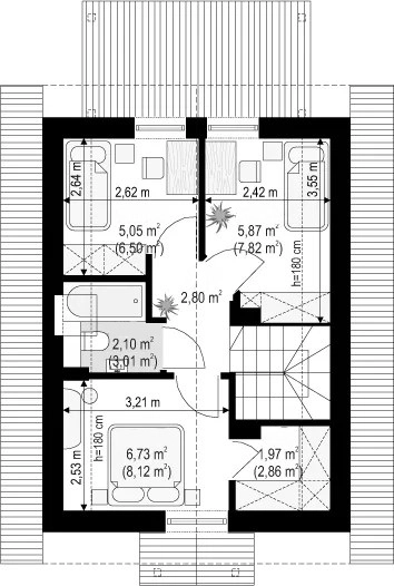Мансарда включает три уютные спальни, гардероб и дополнительную ванную комнату. Такое решение делает дом удобным для семьи из 3–5 человек, обеспечивая комфорт и приватность каждому.