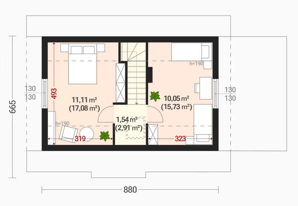 Мансарда отведена под приватную зону отдыха — две комфортные спальни и коридор обеспечивают удобство и уединение для жильцов. Такое зонирование делает дом 128 практичным и удобным для повседневной жизни.