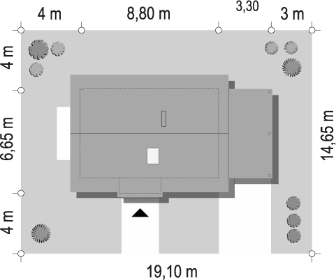 Архитектура дома проста и гармонична: двускатная крыша с углом наклона 45° придаёт строению классический облик, а аккуратные пропорции позволяют разместить его даже на небольшом участке.
