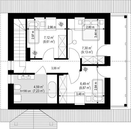Каркасные дома 7х8, такие как этот проект, обеспечивают быструю сборку, энергоэффективность и надежность конструкции. В мансарде дома 7х8 с мансардой находятся две большие комнаты и балкон, создающий приватное пространство для отдыха и сна. В доме каркасном 7х8 одноэтажном планировка продумана так, чтобы каждый метр полезной площади использовался максимально эффективно.