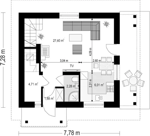 Проект дома 7 на 8 с мансардой — это современное и компактное решение для комфортного проживания. Дом 7 на 8 одноэтажный с мансардой позволяет рационально использовать пространство: на первом этаже расположены гостиная, кухня и столовая, объединённые в единую светлую зону, а также ванная комната. Дополнительно предусмотрена просторная терраса, которая станет отличным местом для отдыха на свежем воздухе.