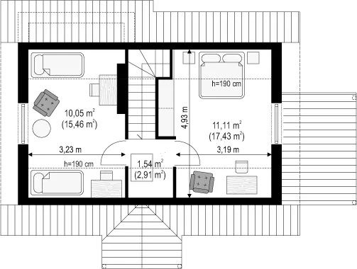 Каркасные дома 7х8, как этот проект, обеспечивают быстрые сроки строительства, энергоэффективность и долговечность. На мансарде дома 7х8 с мансардой предусмотрены три спальни, холл и дополнительная ванная комната, что позволяет чётко разделить дневную и ночную зоны. Каркасный дом 7х8 одноэтажный планировка ориентирована на максимальную функциональность и удобство для семьи из 3–4 человек.