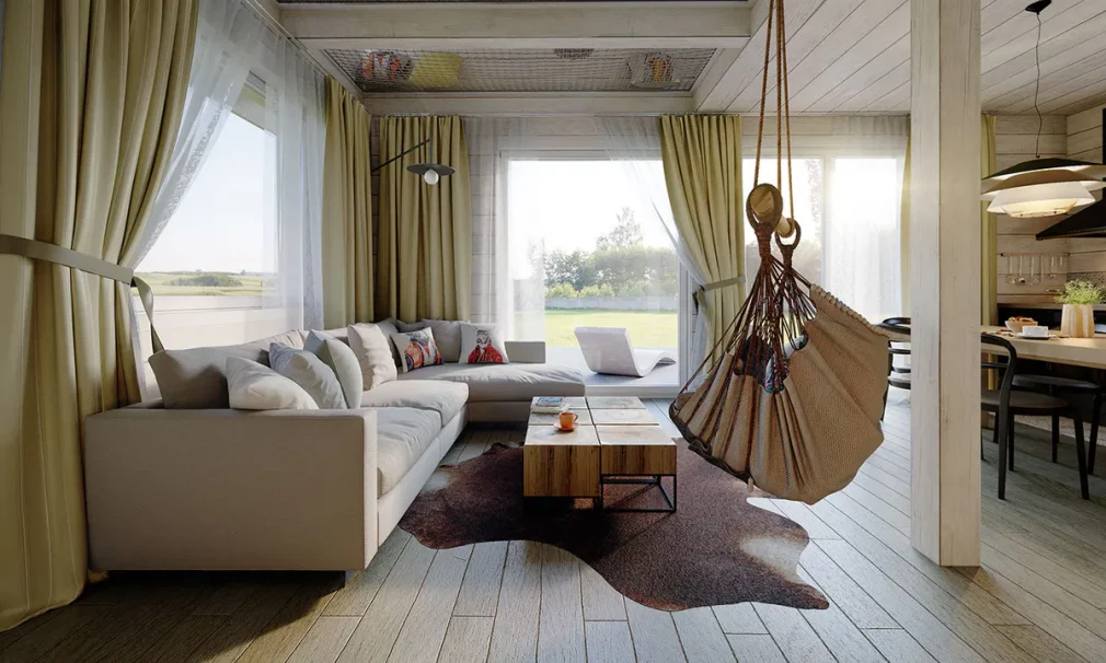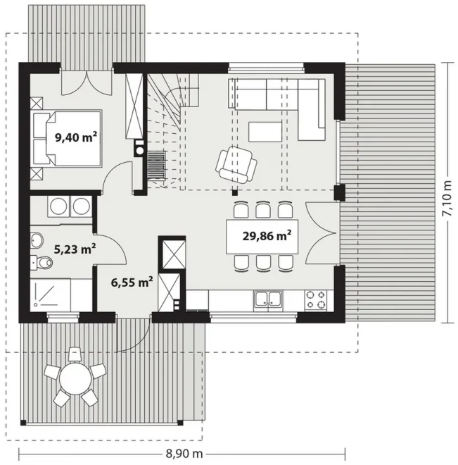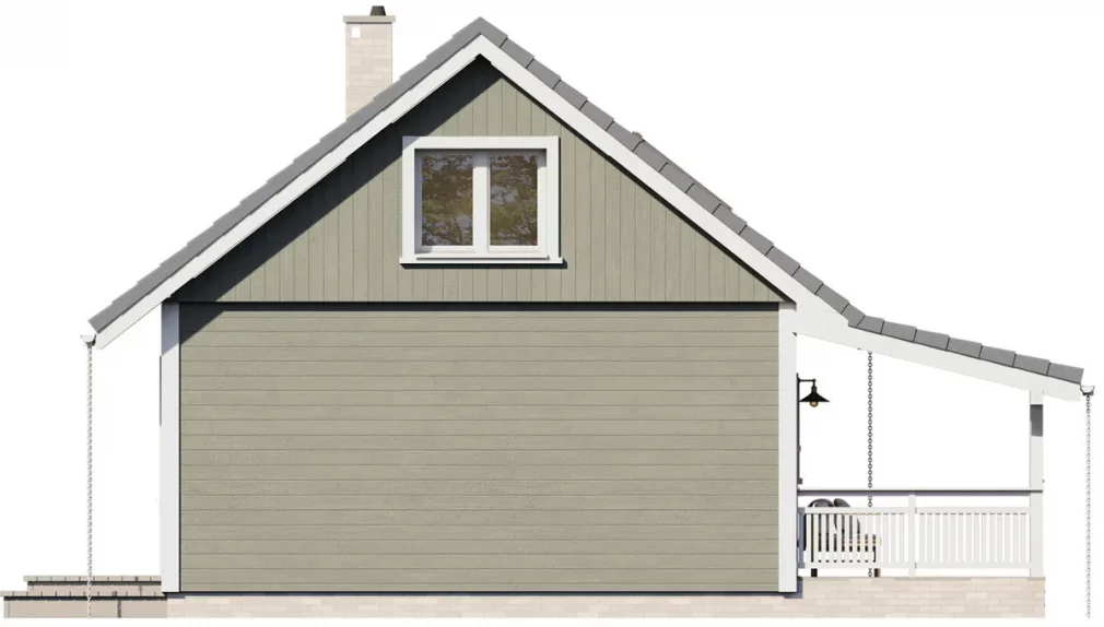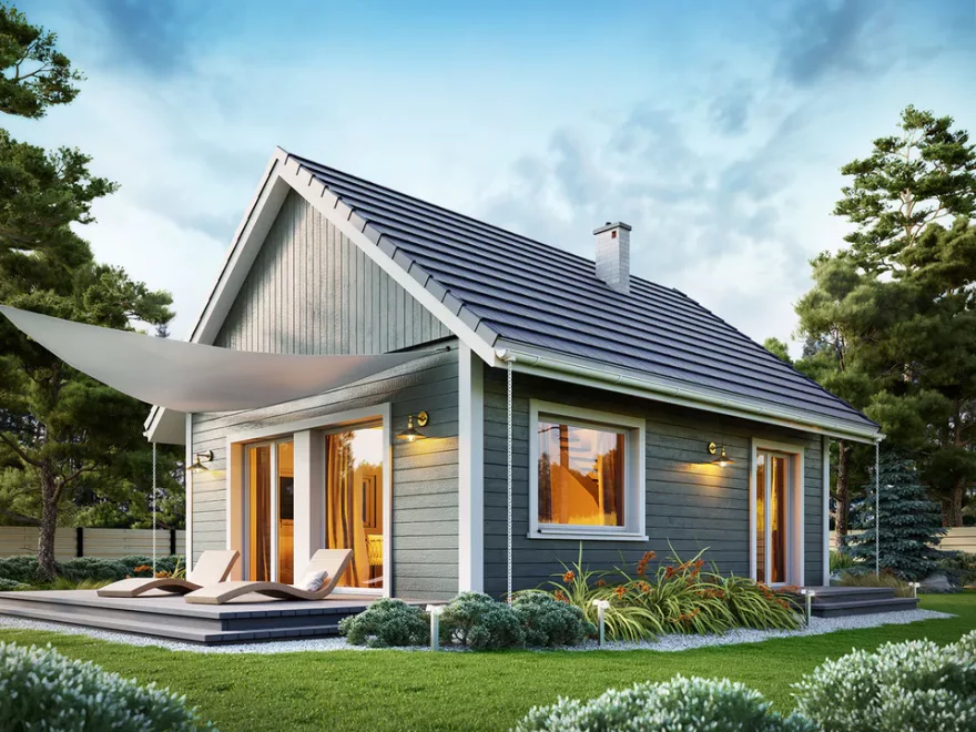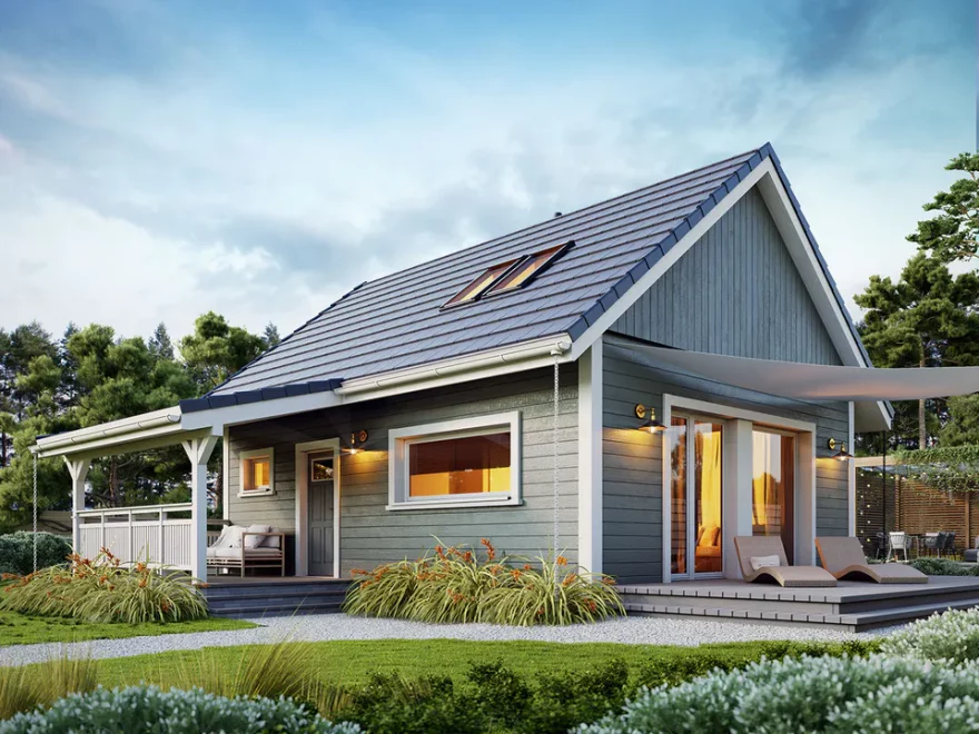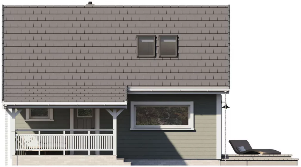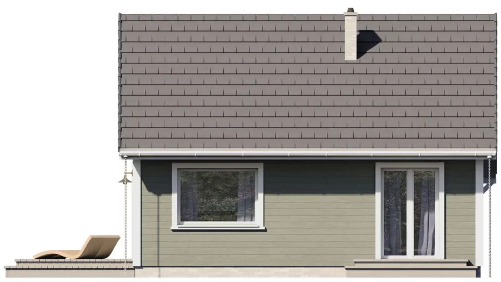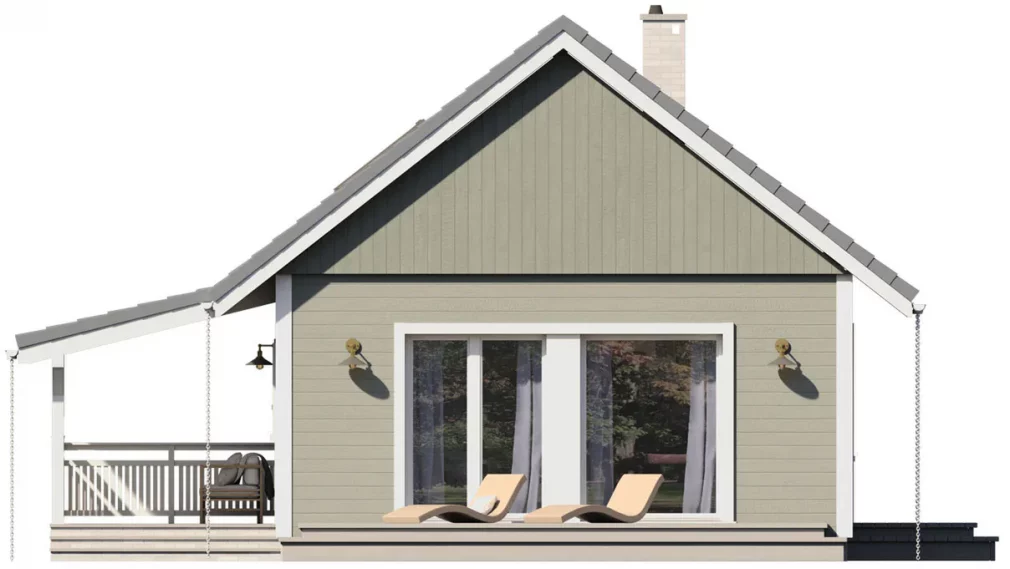 Каркасный дом 7х8 сочетает традиционную форму с современными решениями — большие панорамные окна наполняют пространство светом, а терраса обеспечивает удобную связь с садом.