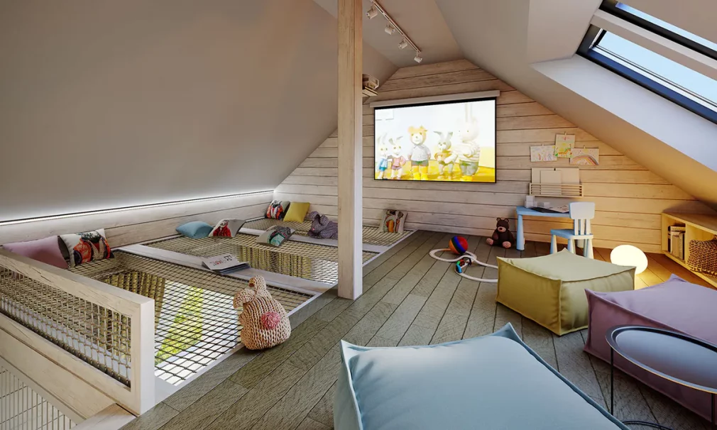 Проект дома 7 на 8 одноэтажный с мансардой представляет собой компактное и функциональное жильё, идеально подходящее для семьи или дачного отдыха. Первый этаж включает просторную открытую зону с гостиной, кухней и столовой, а также отдельную спальню и ванную комнату. Мансарда с антресолью создаёт дополнительное пространство, которое можно использовать как вторую спальню, кабинет или детскую.