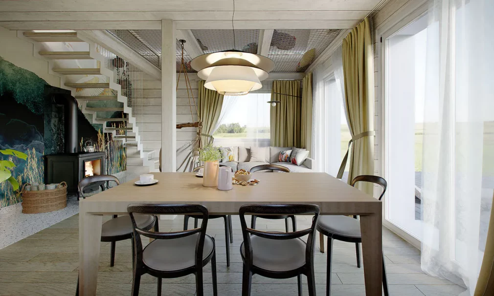 Дом 7 на 8 одноэтажный можно возвести по упрощённой процедуре без разрешения, что делает строительство быстрым и экономичным. В стандартной комплектации предусмотрены камин и тепловой насос, обеспечивающие уют и энергоэффективность круглый год.