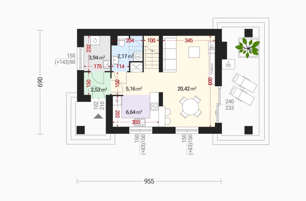 Первый этаж представляет собой светлое открытое пространство, где гостиная и столовая площадью более 20 м² объединены в единую зону. Рядом расположена уютная кухня с угловым окном, создающим ощущение простора и света. Также на этом уровне предусмотрены котельная, прачечная с санузлом и тамбур, изолирующий жилую часть от улицы.