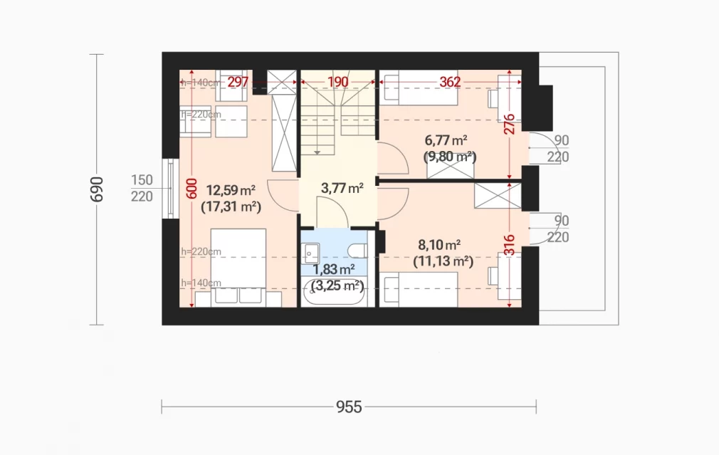 Мансарда включает три комфортабельные спальни и ванную комнату. Благодаря высокой коленной стене помещения получились просторными и удобными даже под скатом крыши. Такое решение делает дом функциональным, сохраняя при этом компактность и энергоэффективность конструкции.