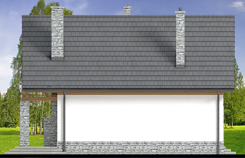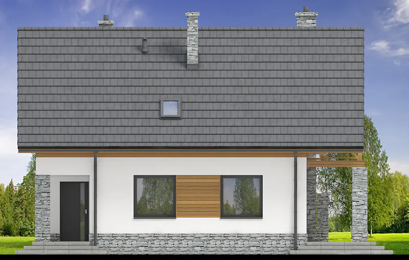 Фасад дома выполнен в современном стиле: лаконичные линии, натуральные отделочные материалы и высокая двускатная крыша под углом 45° создают гармоничный и выразительный облик. Дом легко впишется в любой ландшафт — будь то приозёрная местность или живописный склон.