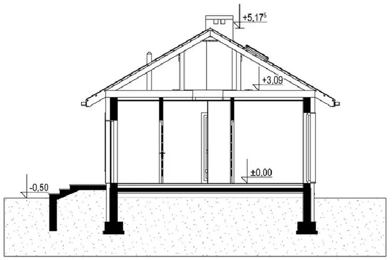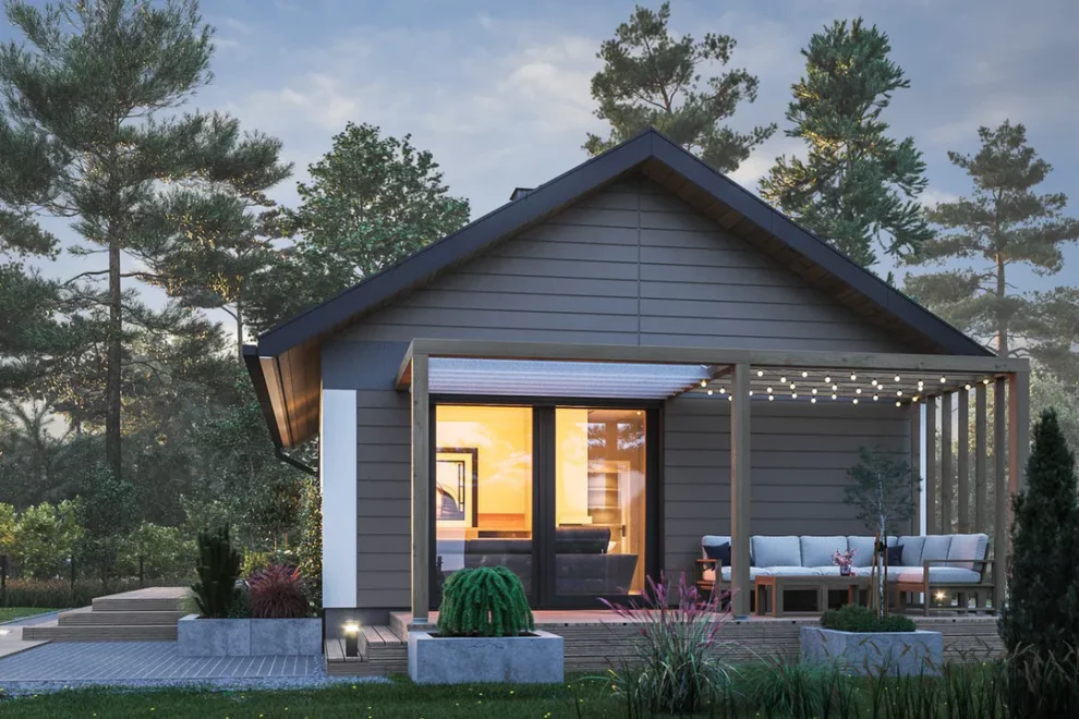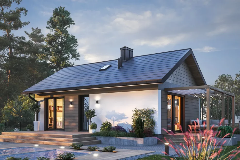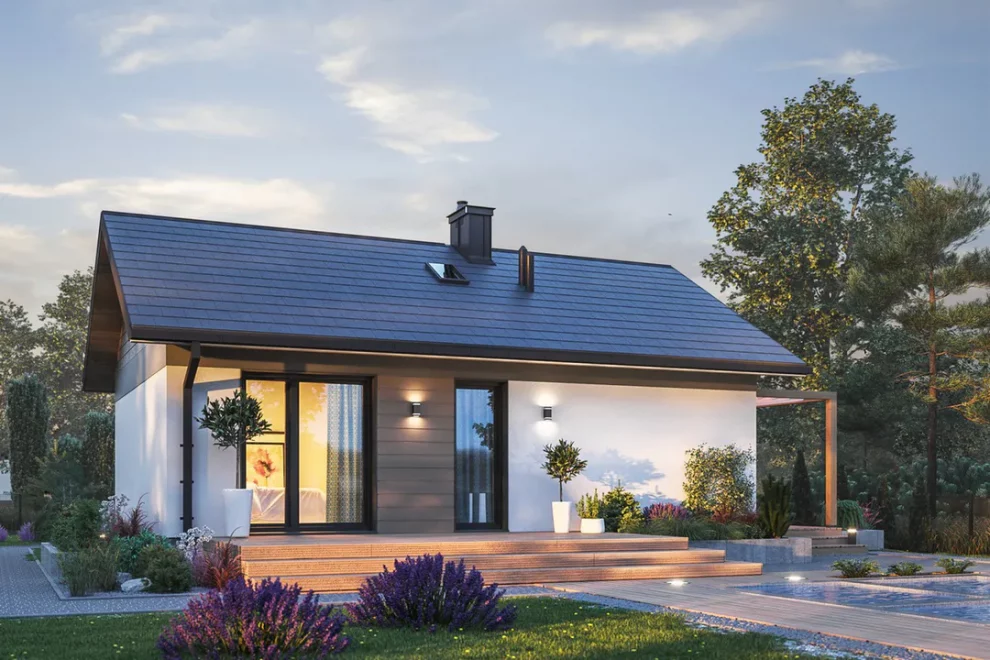 Внутренняя планировка продумана до мелочей. В доме предусмотрены две уютные спальни, просторная гостиная и кухня-столовая, объединённые в единое светлое пространство. Благодаря удобной планировке и панорамным окнам комнаты наполнены естественным светом, а летом площадь отдыха можно увеличить за счёт террасы, расположенной сбоку здания. Дополняют функциональную схему ванная комната, холл и тамбур, обеспечивающие комфорт и практичность при повседневном использовании.