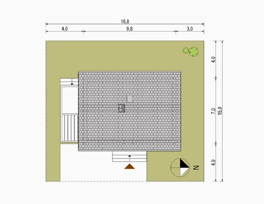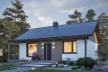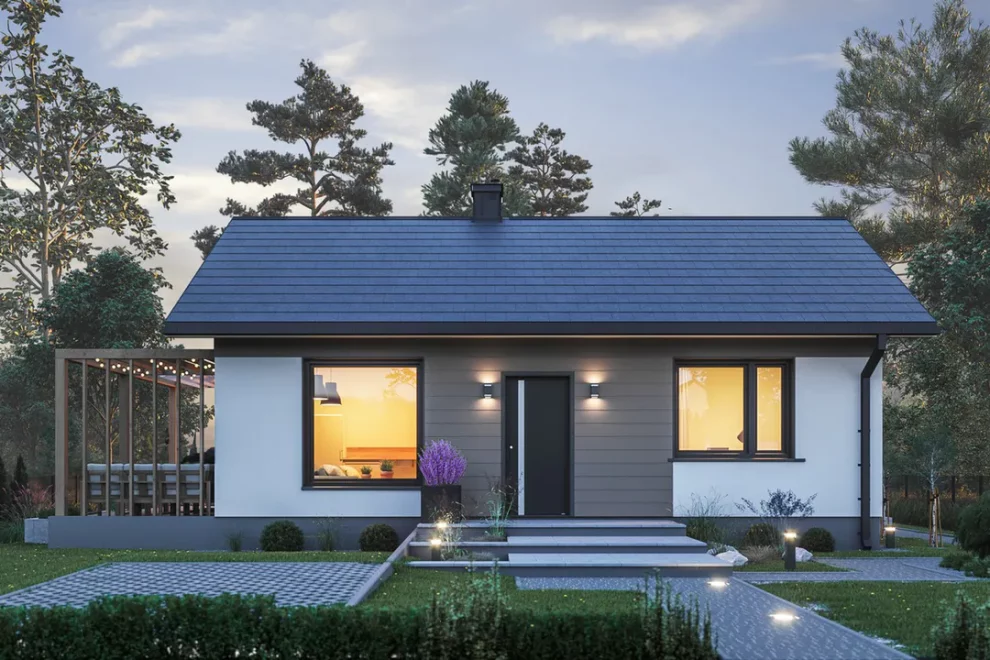 Современный внешний облик дома формируют лаконичные линии, аккуратная двускатная крыша с углом наклона 30° и контрастные отделочные материалы, подчеркивающие архитектурную чистоту формы. Небольшая площадь застройки позволяет разместить здание даже на компактном участке, сохранив при этом пространство для сада или зоны отдыха.