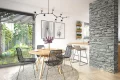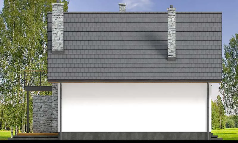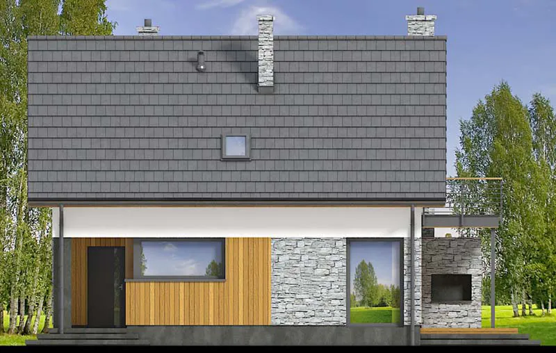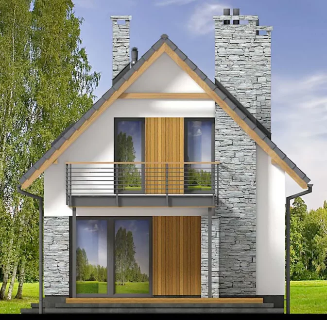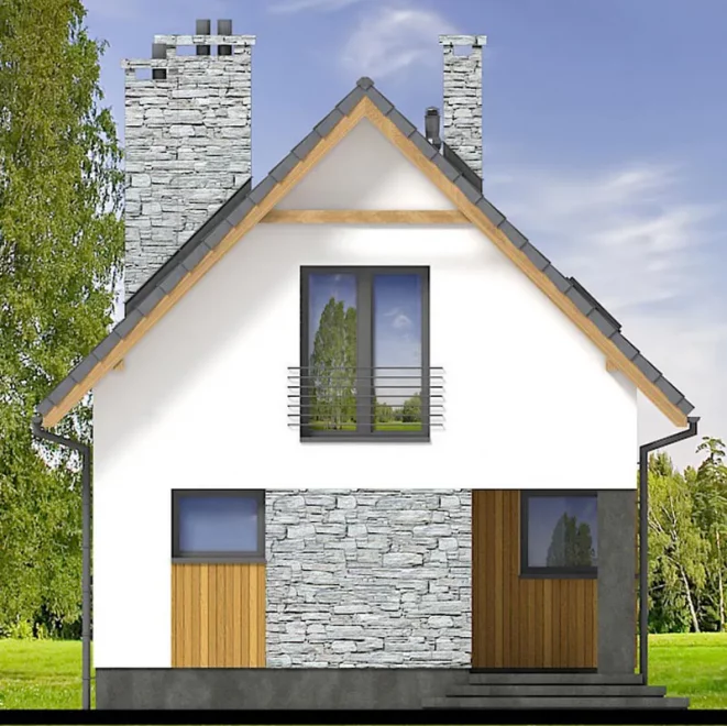 Фасад выполнен в современном стиле с элементами классики: лаконичные линии, натуральные материалы и гармоничные пропорции создают ощущение лёгкости и тепла. Высокая двускатная крыша под углом 45° делает силуэт дома выразительным и визуально увеличивает внутреннее пространство.