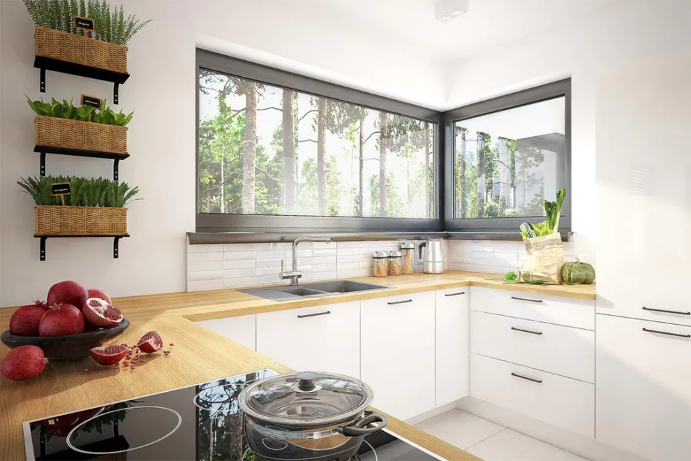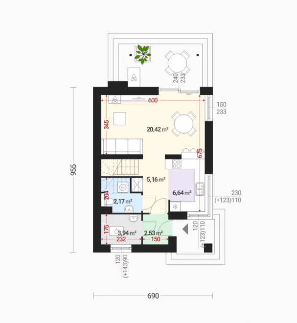 На первом этаже расположена просторная гостиная с обеденной зоной и кухня с угловым окном, которое наполняет помещение светом и создаёт уютную атмосферу. Дополняют планировку холл, санузел, котельная и изолированный тамбур. Просторное помещение котельной позволяет установить твердотопливное или газовое отопление, в зависимости от предпочтений владельца.