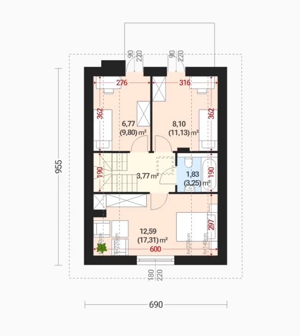 Мансардный этаж включает три удобные спальни и ванную комнату. Благодаря высокой коленной стене комнаты получаются полноценными по высоте, а значит — максимально комфортными для постоянного проживания.