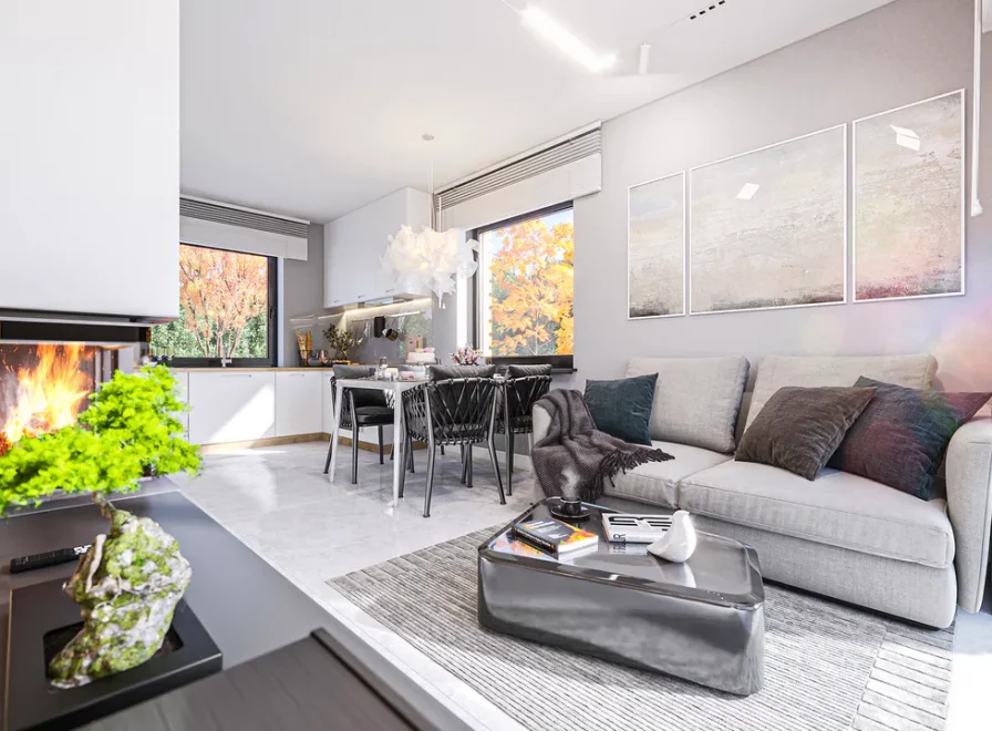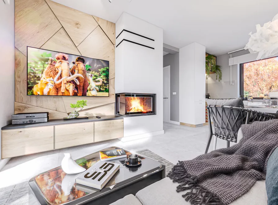 Первый этаж объединяет функциональность и уют: просторная гостиная с кухней и обеденной зоной создаёт единое открытое пространство, где приятно проводить время всей семьёй. Рядом расположены ванная комната, котельная с прачечной и дополнительная спальня, которую можно использовать как кабинет или гостевую. В доме предусмотрены два варианта отопления — газовое или с использованием теплового насоса, что позволяет адаптировать проект под разные условия эксплуатации. Центральный камин в гостиной не только украшает интерьер, но и служит дополнительным источником тепла в холодный сезон.