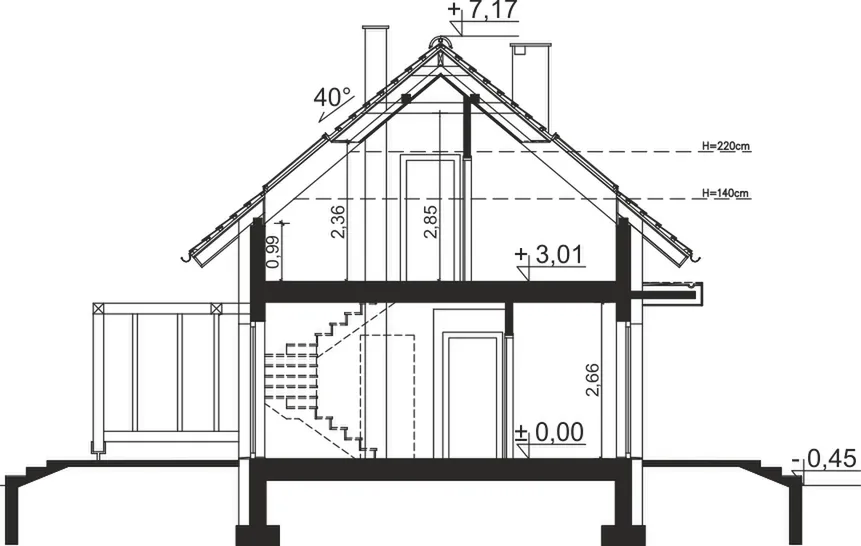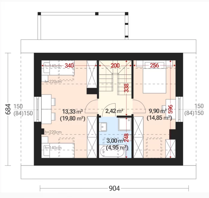 На мансарде расположена уютная родительская спальня, детская комната и просторная ванная. Благодаря углу наклона крыши 40° и удачным пропорциям, помещения получились светлыми и удобными для повседневного использования.