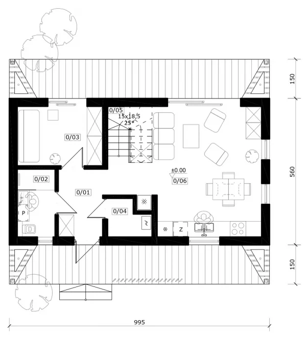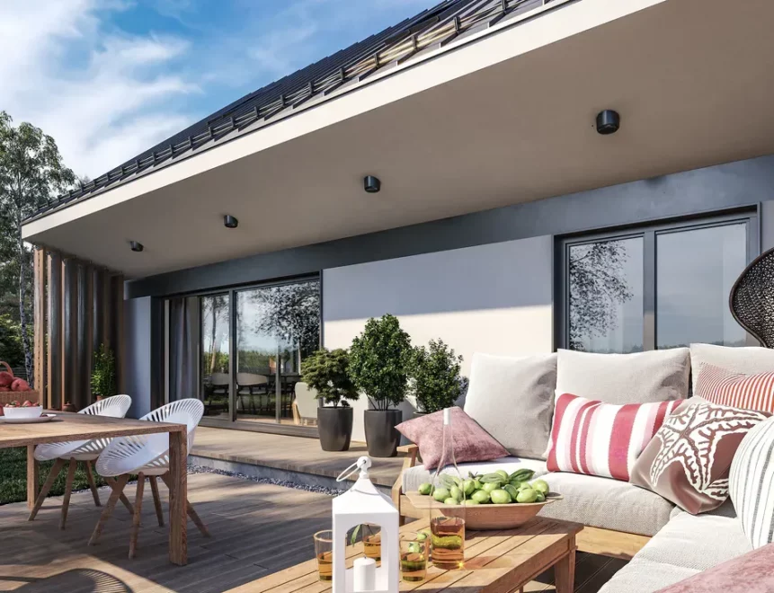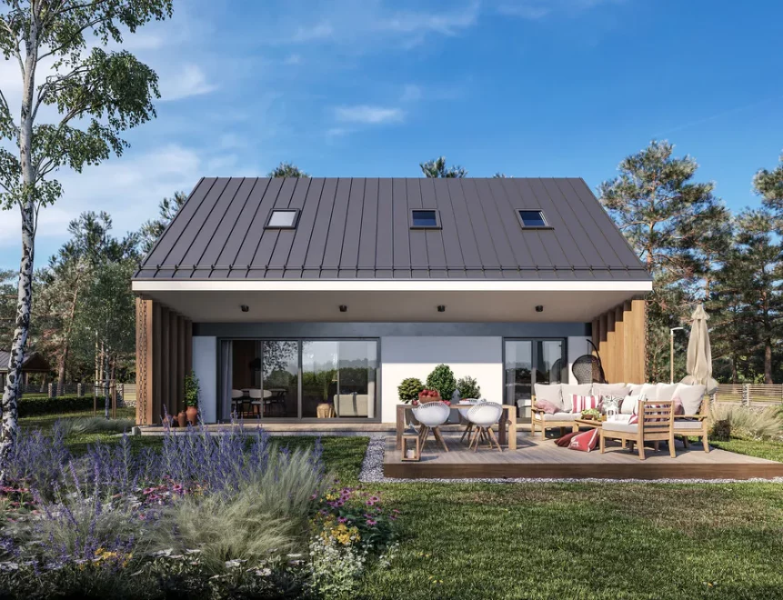 Дом 155 прекрасно подойдёт для узких участков и органично впишется в любую среду — от городских окраин до сельских пейзажей. Просторная терраса и большие окна наполняют интерьер светом и создают ощущение простора.